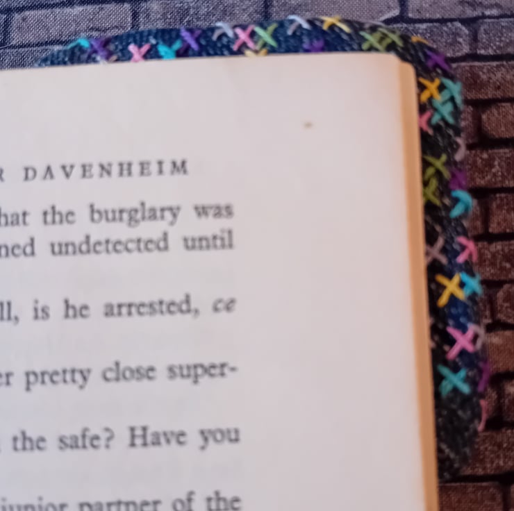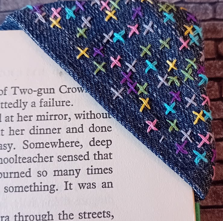 Bold & Bright Corner Bookmark – Upcycled Denim with Pastel Stitches!