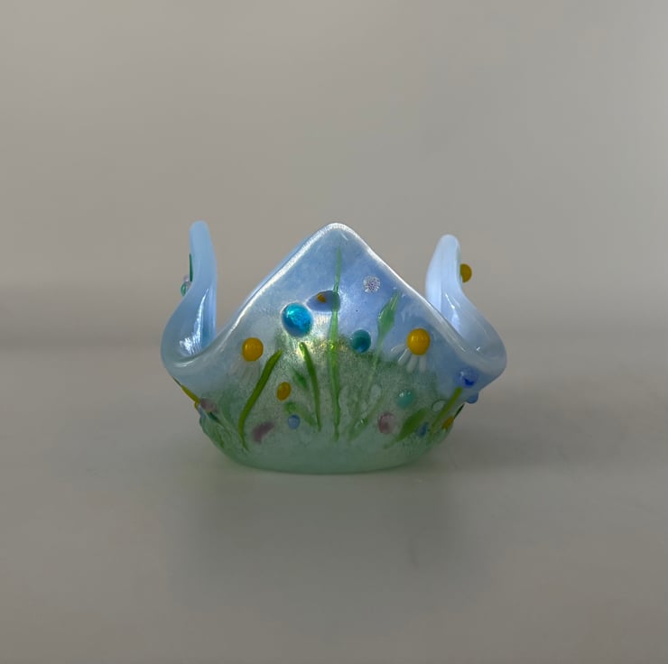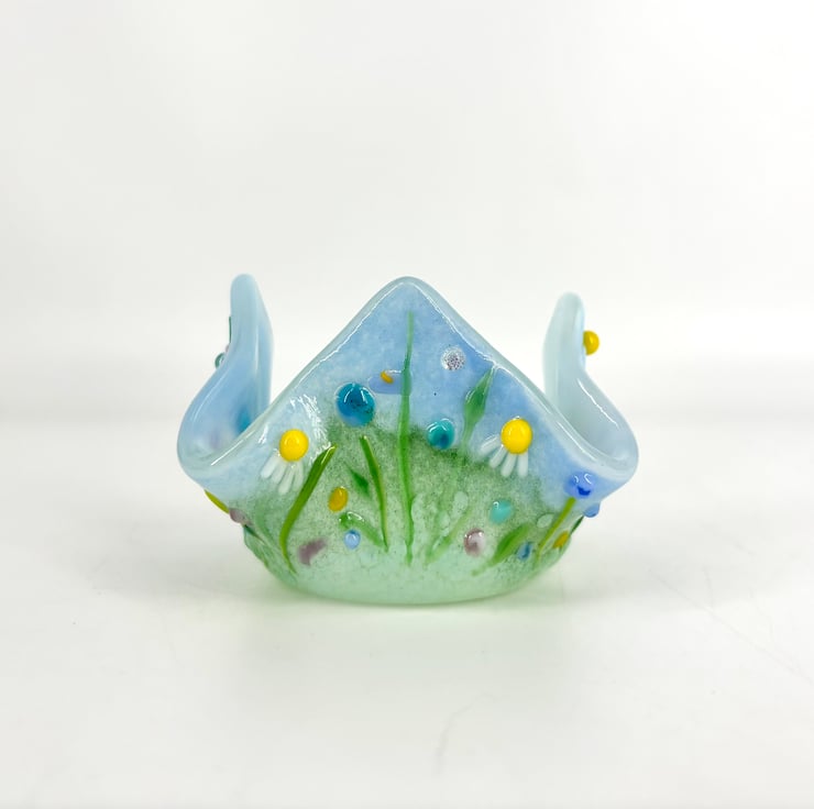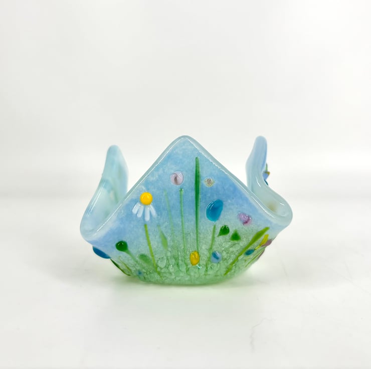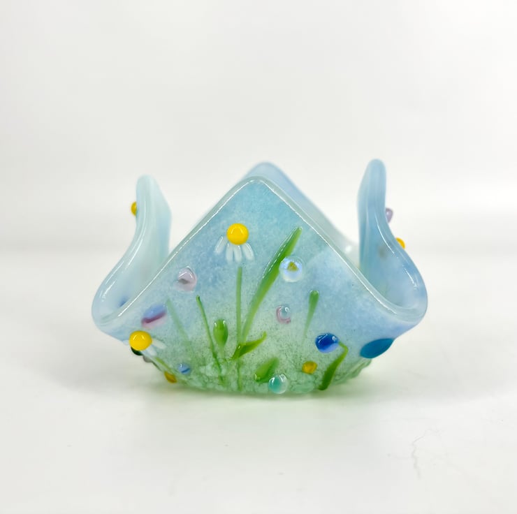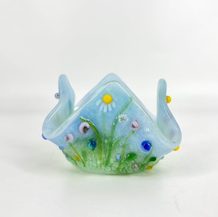 It has been fired in stages and on its final visit to the kiln it is put over a mould and when it heats the glass drapes into folds giving it its gorgeous shape.