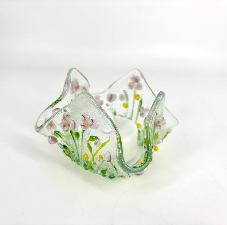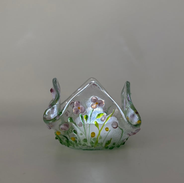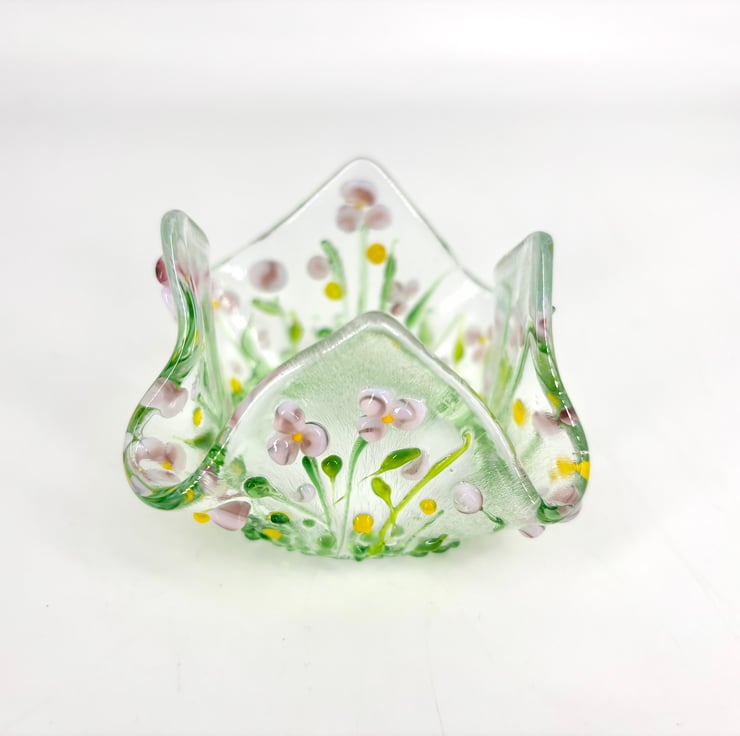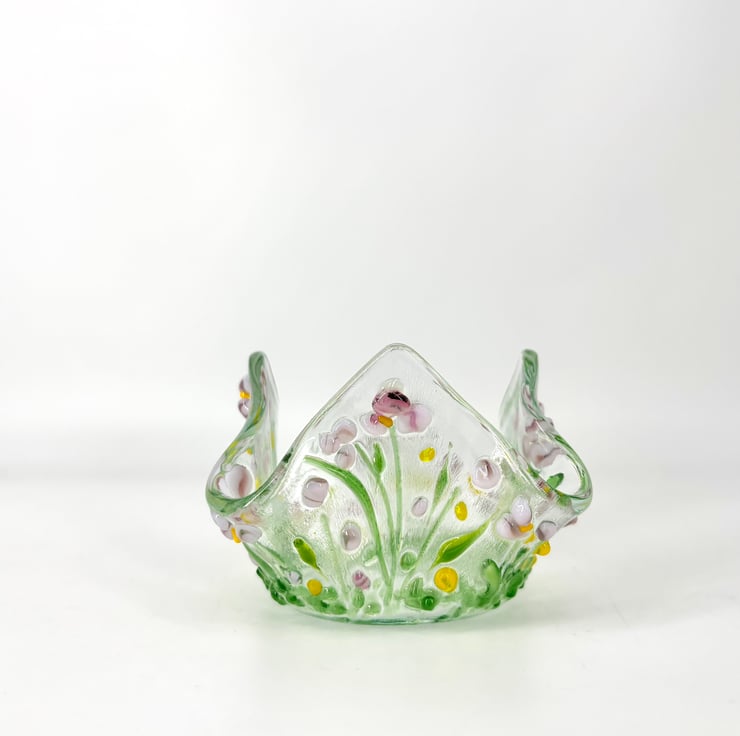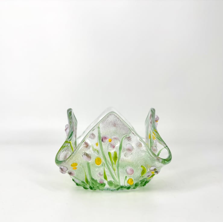 It has been fired in stages and on its final visit to the kiln it is put over a mould and when it heats the glass drapes into folds giving it its gorgeous shape.