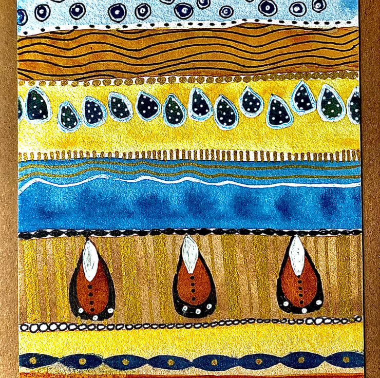 Handpainted umber, gold and blue folksy watercolour card with gold, black and white ink embellished patterning. Painted on watercolour paper and mounted on high-quality grade A6 300gsm brown craft card. Eco friendly, acid and lignin free. Made from recycled craft paper 105 x 148 millimetres. Blank inside for your own personal message with brown envelope.