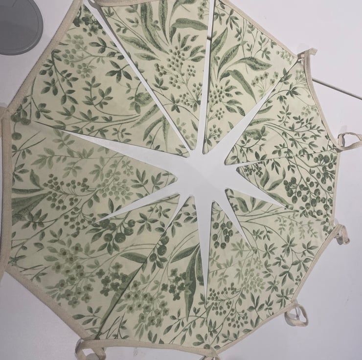 This bunting has a total of 10 flags. Each double-sided flag measures 7.5 x 9 inches (approx.) The total length is 4 metres (approx) from loop-end to loop-end. There is plenty of space to tie the ends if required, and there are also loops on each end for easy hooking onto things.