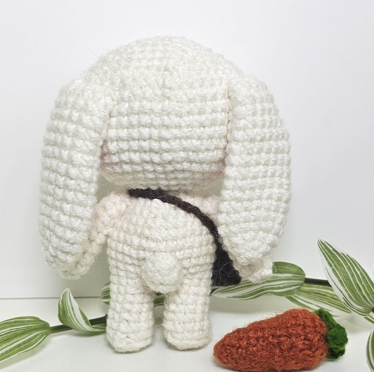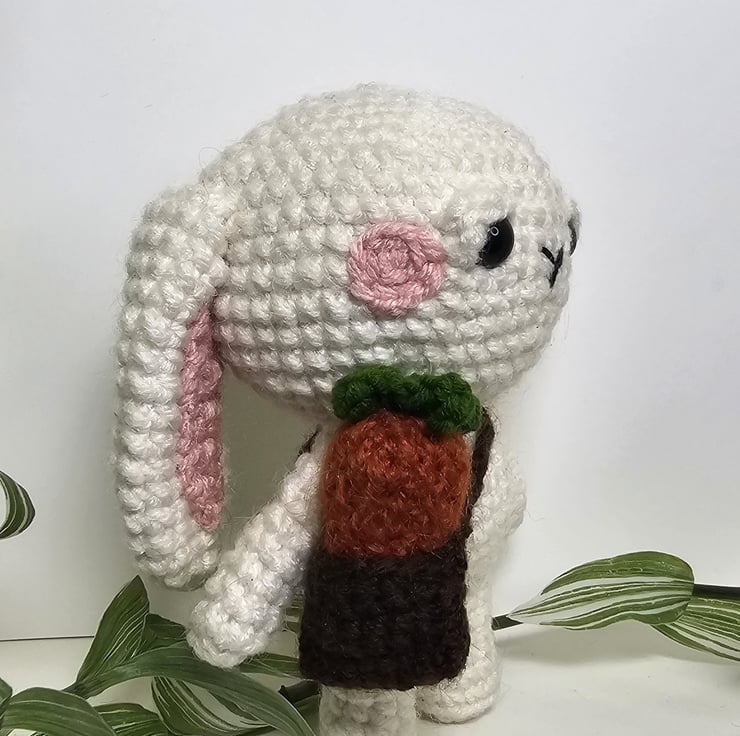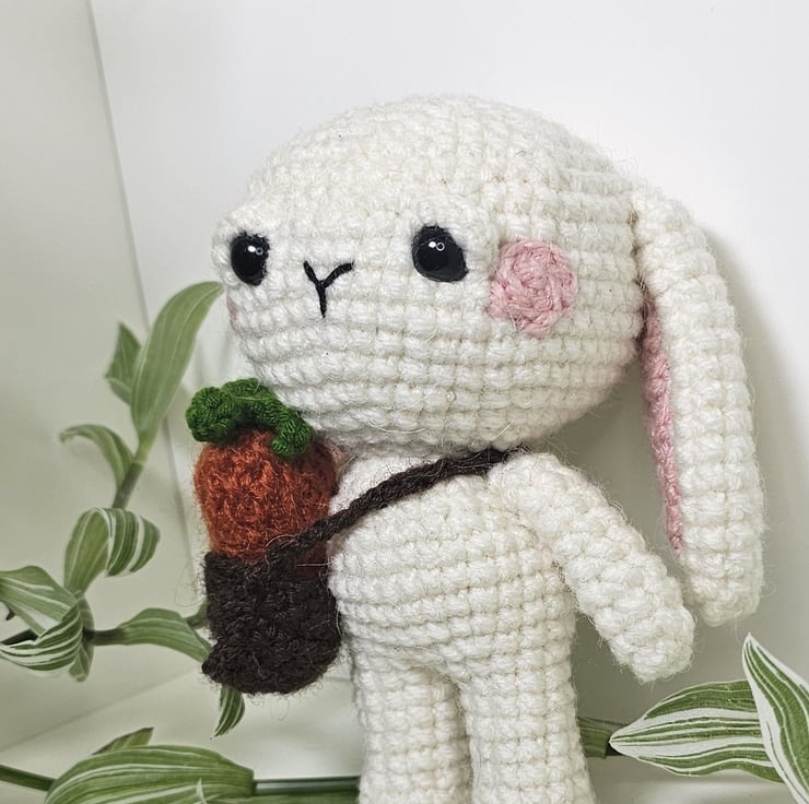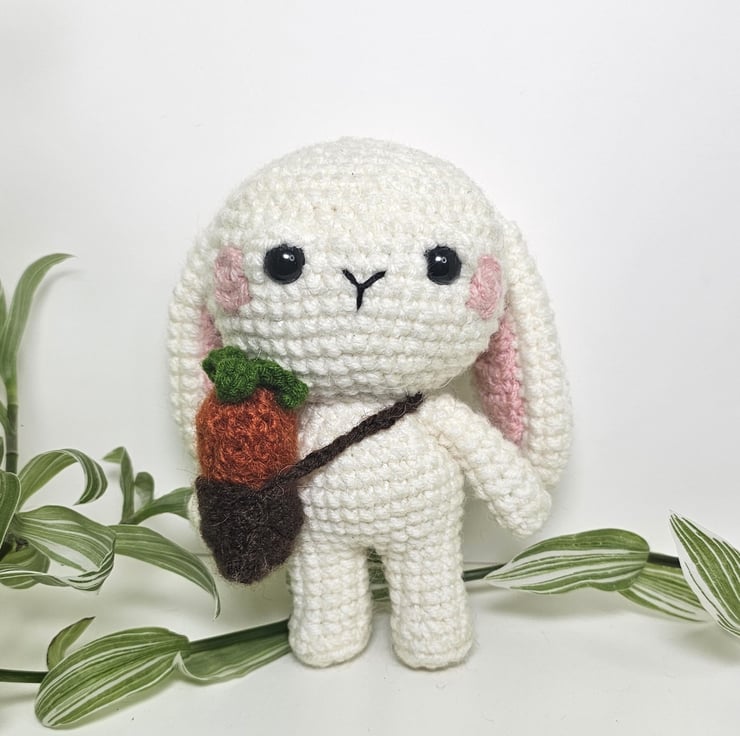 A little friend that has been lovingly crocheted in a blend of acrylic and natural wool, with safety eyes. The bunny is a little over 15cm tall with a shoulder bag and a separate 6cm carrot. They are well stuffed, weighing in at 112g.