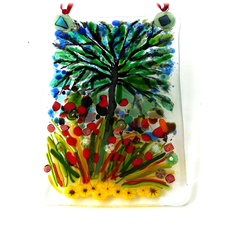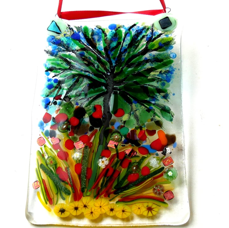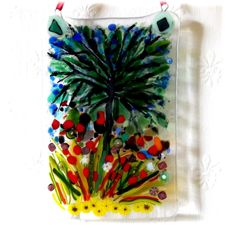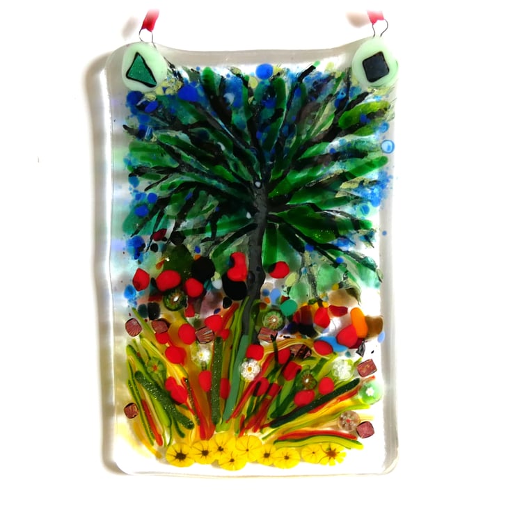 This is a Tree of life, a fused glass picture, a wall or window hanging. A picture in the Impressionist painting style.