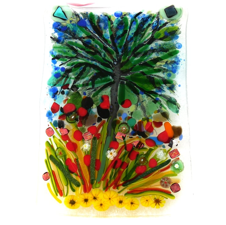 I’ve used enamel glass paint to form the tree and branches and then added glass stringers and frit and millefiori to complete the picture. Bright dichroic snips add interesting sparkle.