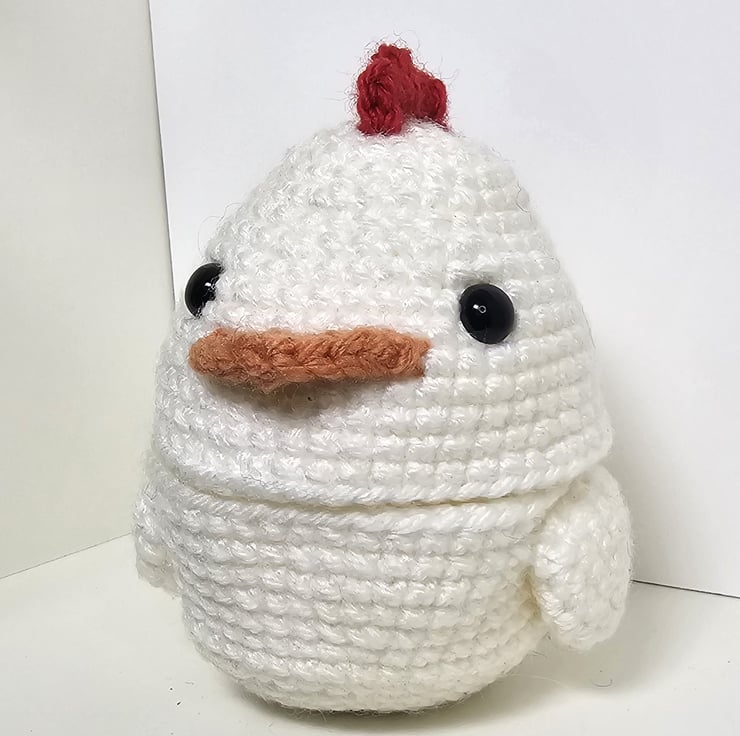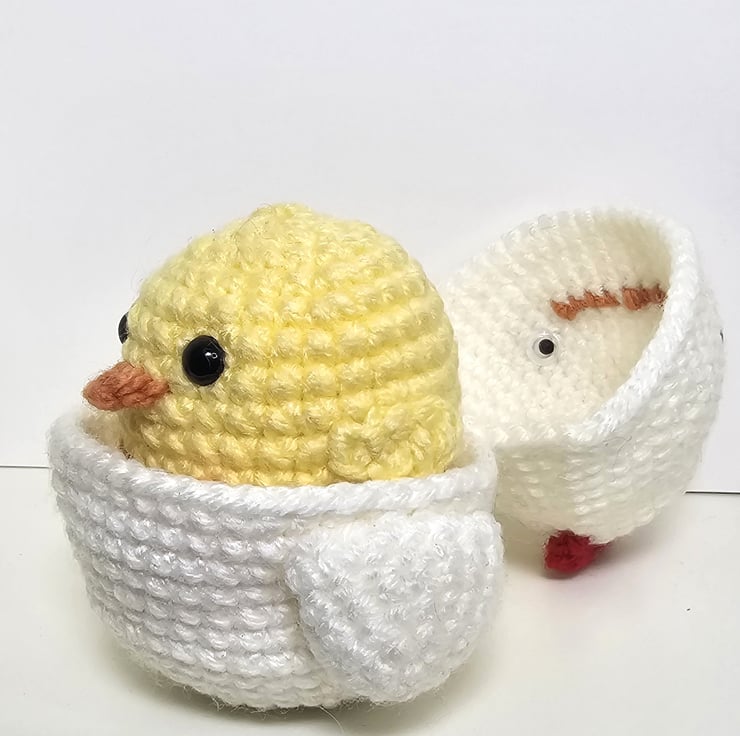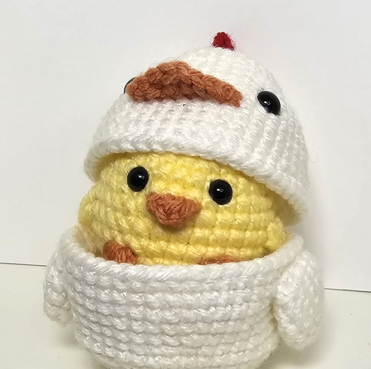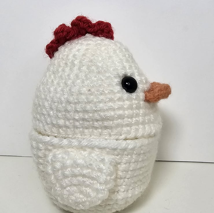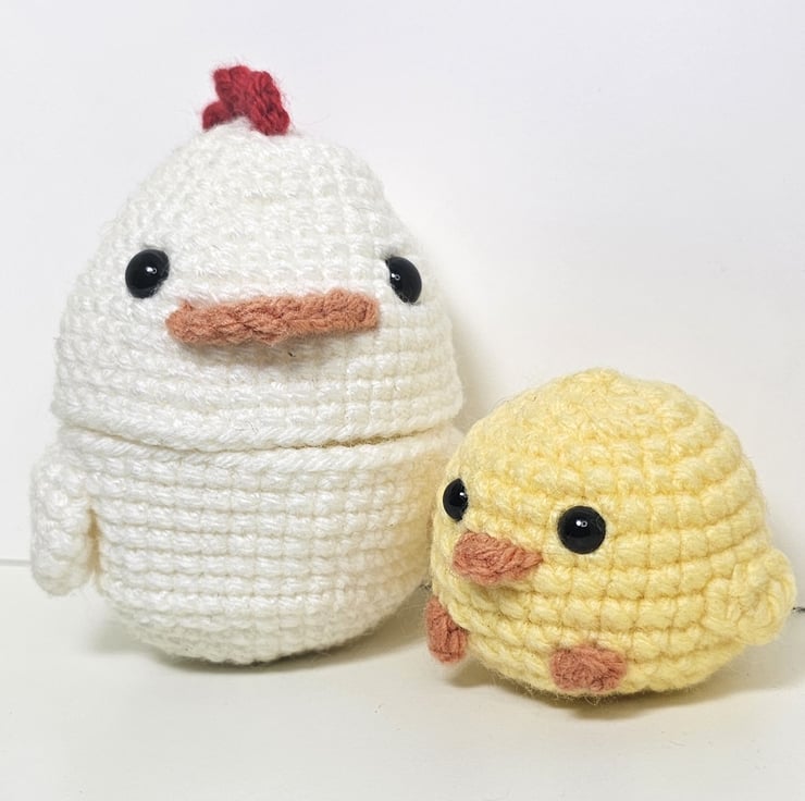 A cute round chick that comes nestled inside of a white egg shaped mother hen. Both are hand crocheted with an acrylic blend wool and feature plastic safety eyes. This adorable and durable duo would be a great nursery decoration, toddler toy, or as a gift for someone that loves chickens or Easter.