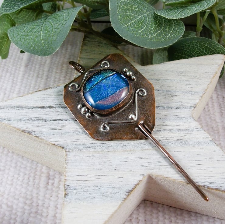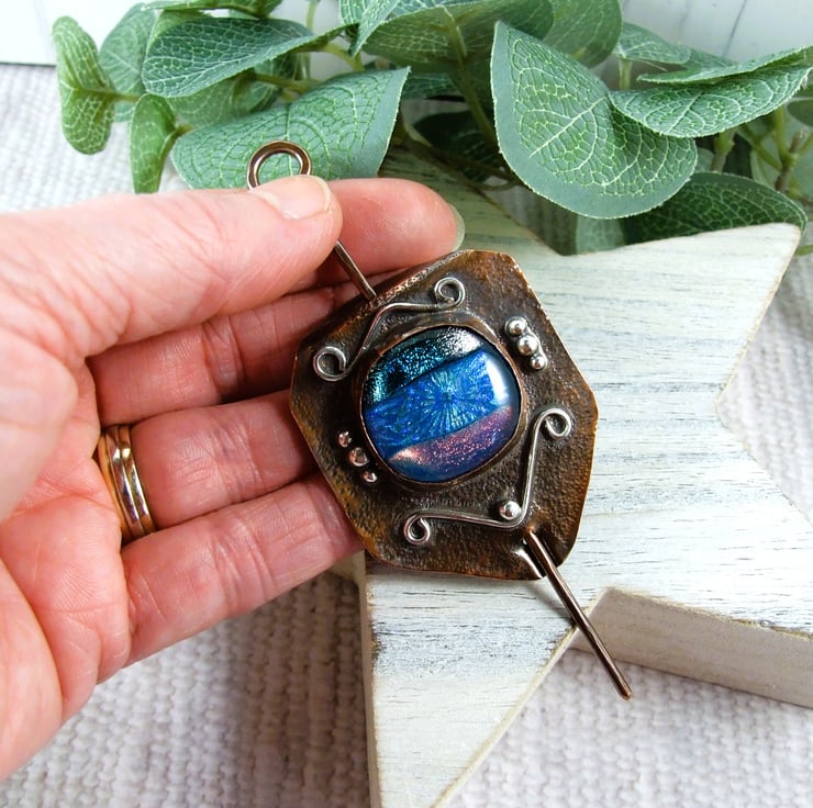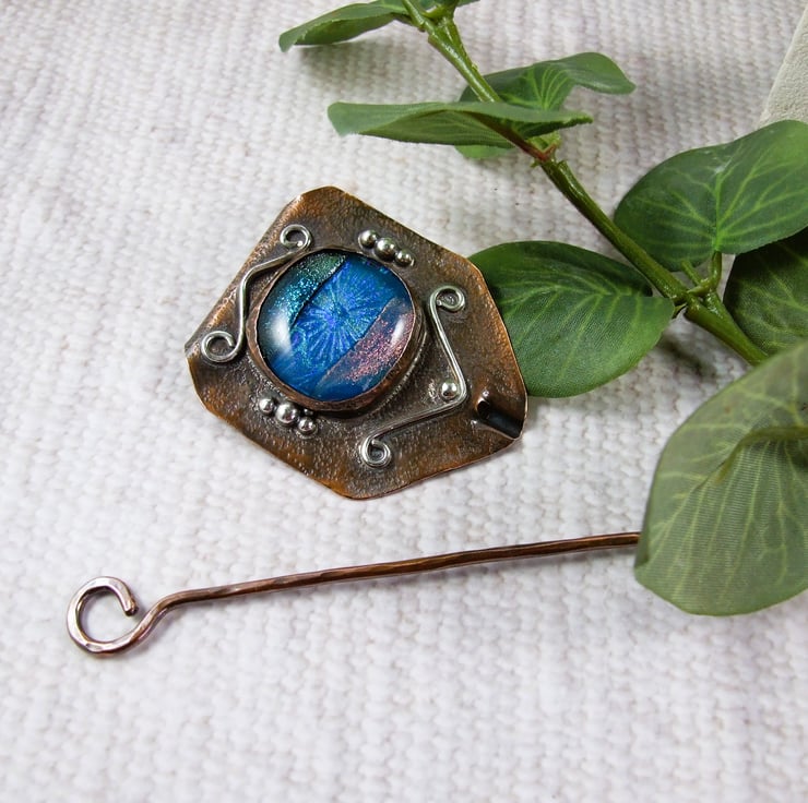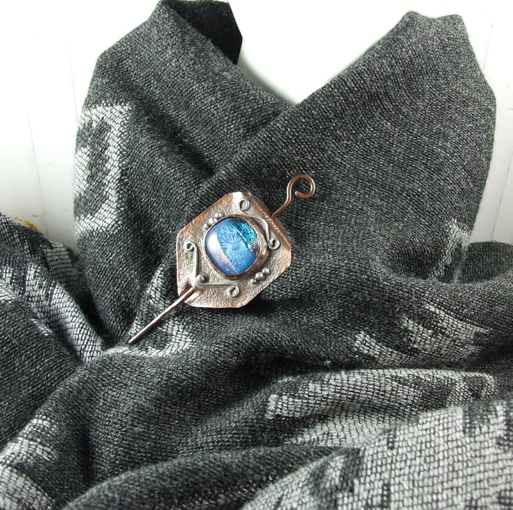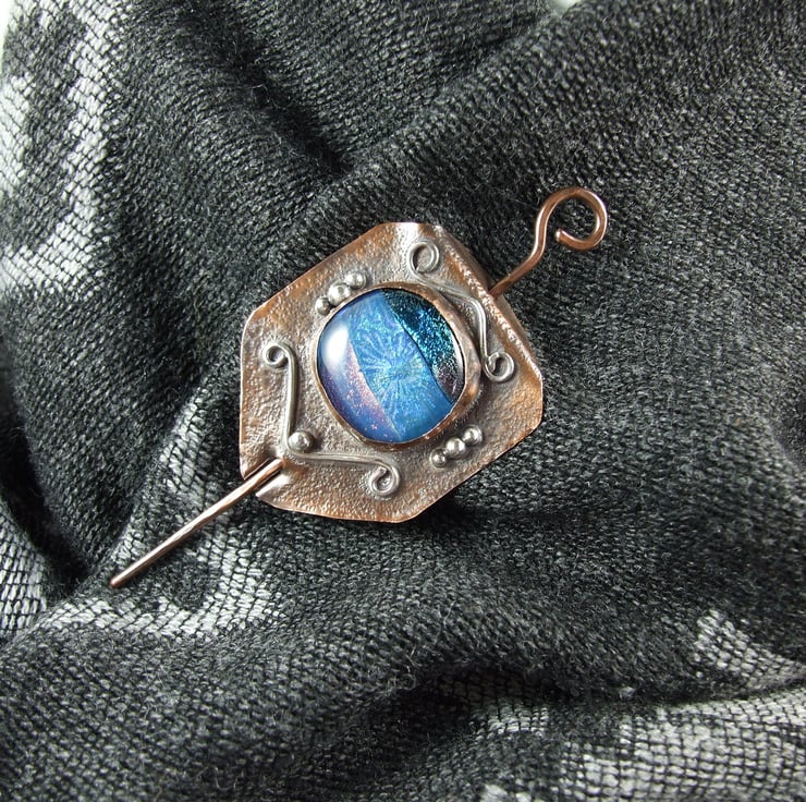 The shawl pin is a one off design in a freeform style with a copper base and pin. I created the base by cutting a shape from copper sheet then texturing bending and creating a channel for the pin to slide through. I made the dichroic glass cabachon from small fragments of patterned and blue tones of glass which has then been fused in my kiln. The cabachon is set in a copper bezel made to fit the glass perfectly and finished with white metal embellishment for contrast.