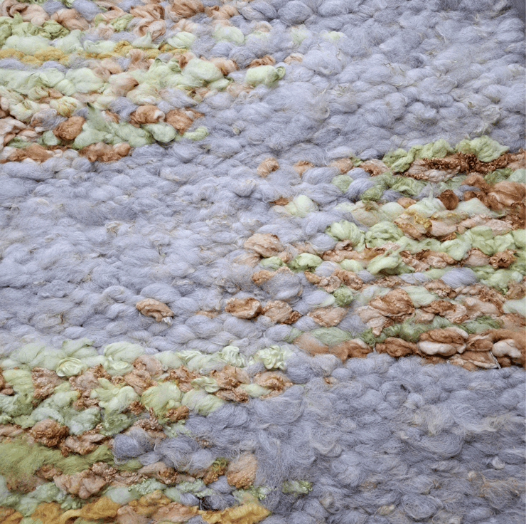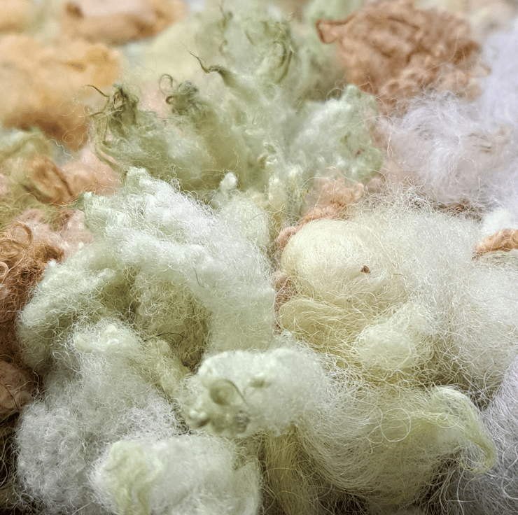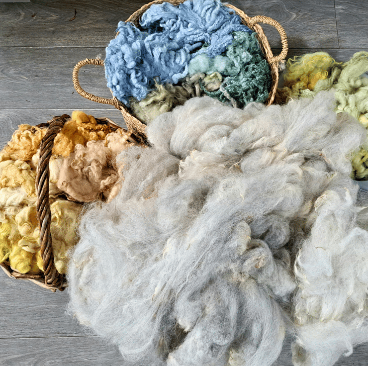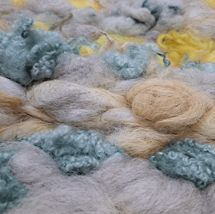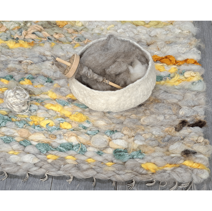 Naturally Grey to brown wool with hand-dyed accents in green, yellow and beige colours