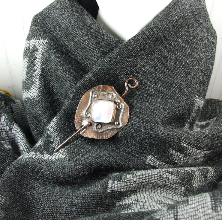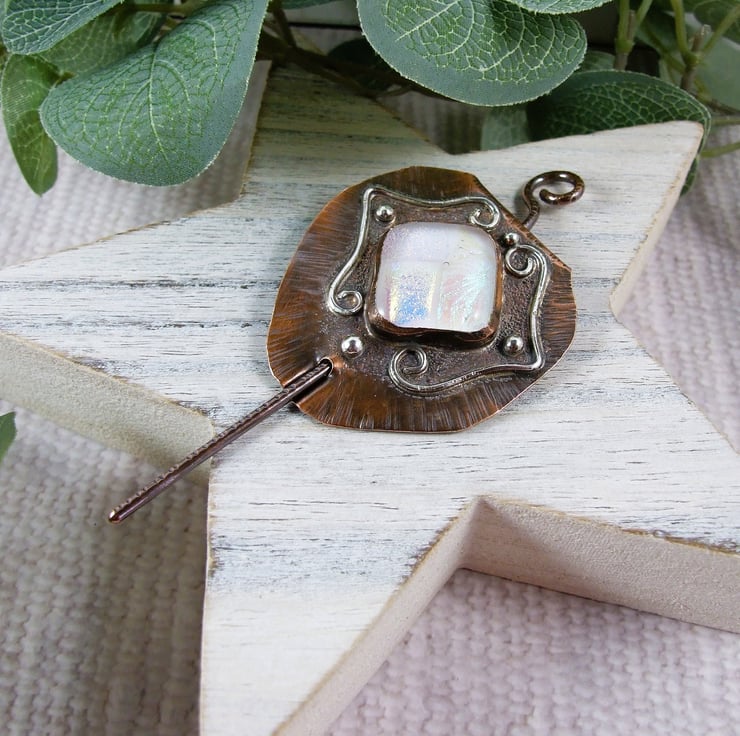 One of a kind copper shawl pin brooch with my own artisan made white aurora dichroic glass cabachon for Open Weave or Knit Shawl, Scarf, Wrap or Cardigan.