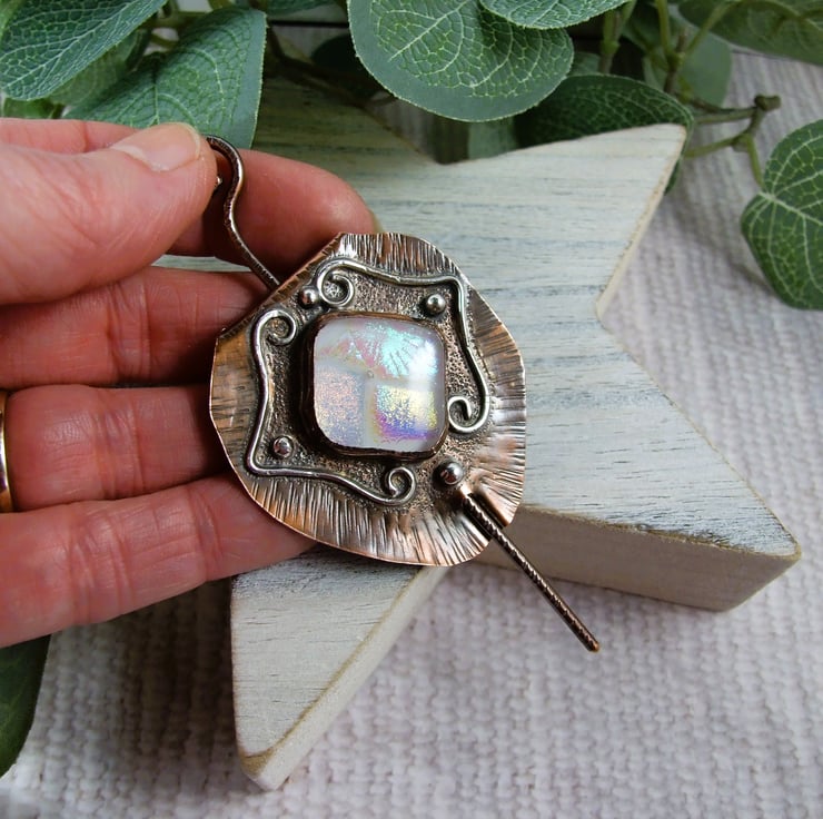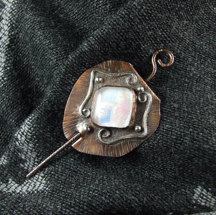 The shawl pin is a one off design in a freeform style with a copper base and pin. I created the base by cutting a shape from copper sheet then texturing bending and creating a channel for the pin to slide through. I made the dichroic glass cabachon from small fragments of patterned and white with an aurora coating glass which has then been fused in my kiln. The cabachon is set in a copper bezel made to fit the glass perfectly and finished with white metal embellishment for contrast.