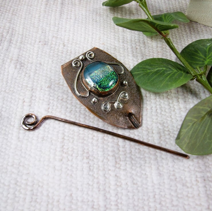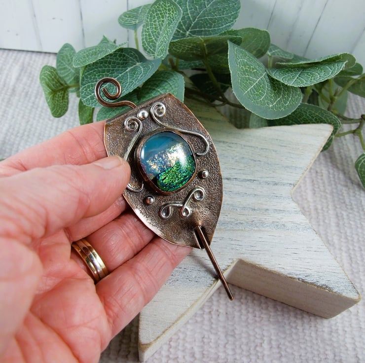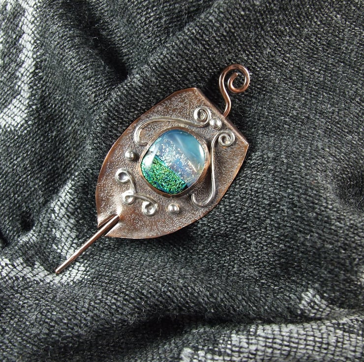 The shawl pin is a one off design in a freeform style with a copper base and pin. I created the base by cutting a shape from copper sheet then texturing bending and creating a channel for the pin to slide through. I made the dichroic glass cabachon from small fragments of patterned blue green glass which has then been fused in my kiln. The cabachon is set in a copper bezel made to fit the glass perfectly and finished with white metal embellishment for contrast.