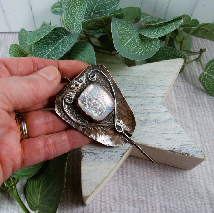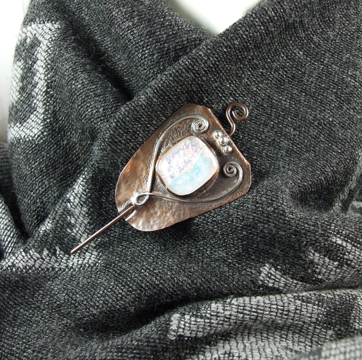 The shawl pin is a one off design in a freeform style with a copper base and pin. I created the base by cutting a shape from copper sheet then texturing bending and creating a channel for the pin to slide through. I made the dichroic glass cabachon from small fragments of patterned and white with an aurora coating glass which has then been fused in my kiln. The cabachon is set in a copper bezel made to fit the glass perfectly and finished with white metal embellishment for contrast.