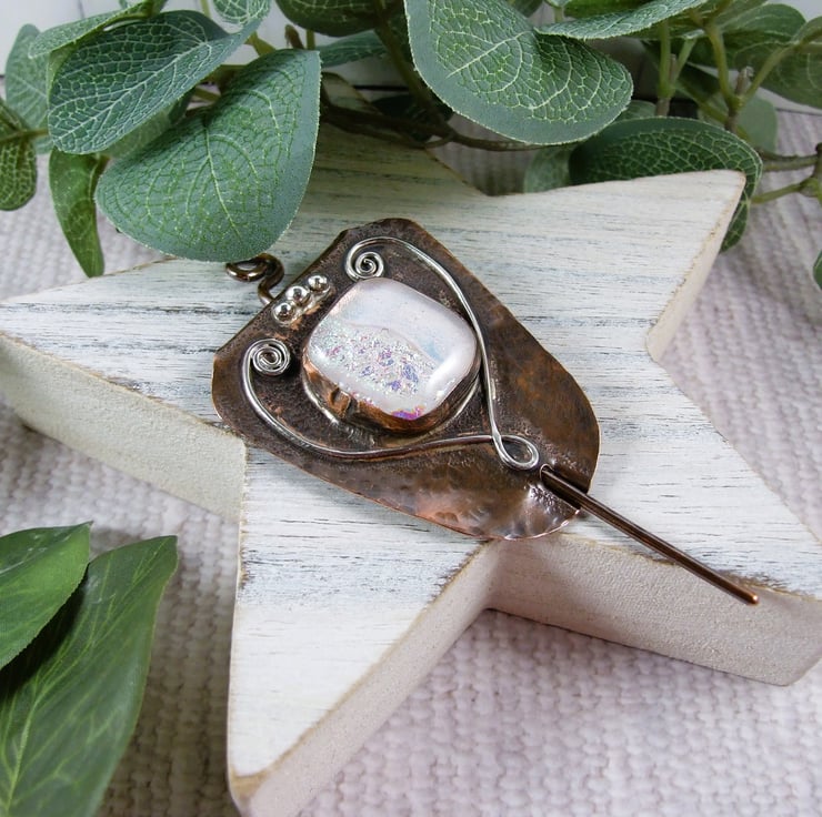 One of a kind copper shawl pin brooch with my own artisan made white shimmery dichroic glass cabachon for Open Weave or Knit Shawl, Scarf, Wrap or Cardigan.