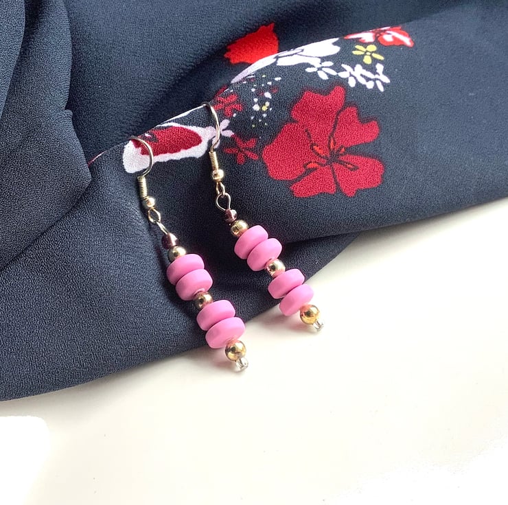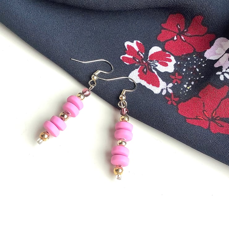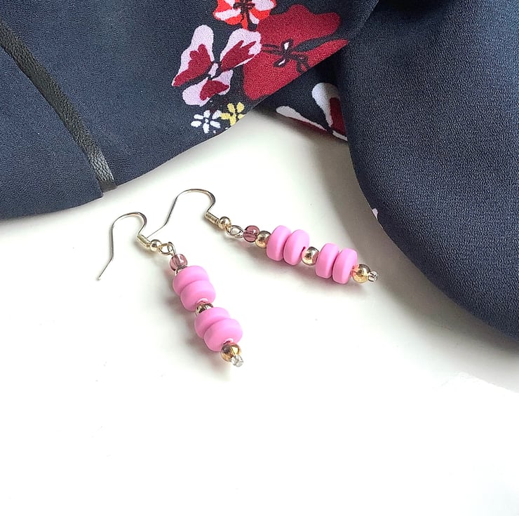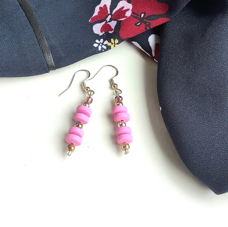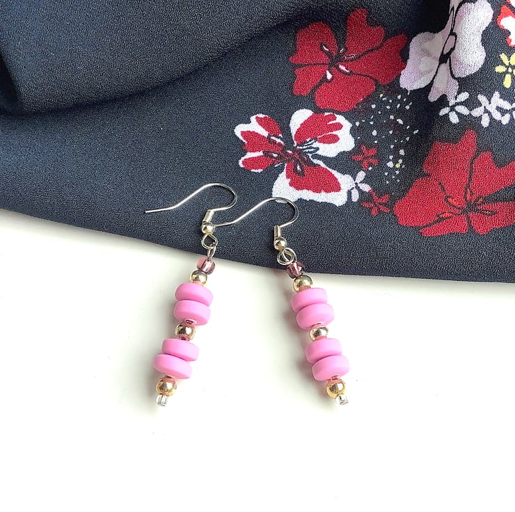 Cute pretty lilac pink and pale gold bead earrings. Polymer clay beads and seed beads