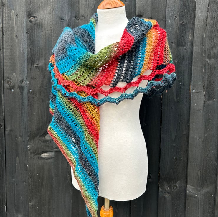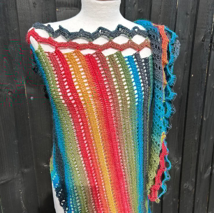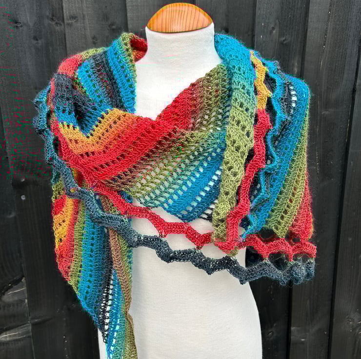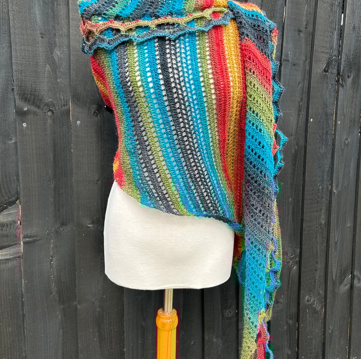 Another variation of asymmetrical triangle. Really enjoying trying different stitch approaches to see how these wraps turn out. In thin but strong sock yarn, these scarves turn out vibrant in colour while light in weight with a nice drape to them.