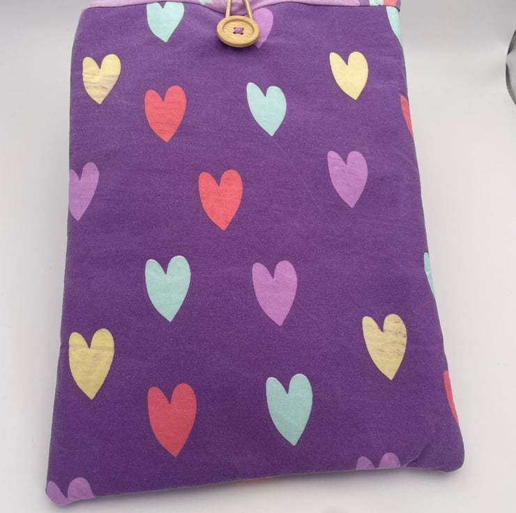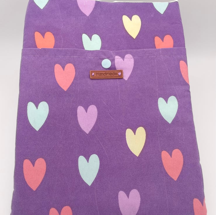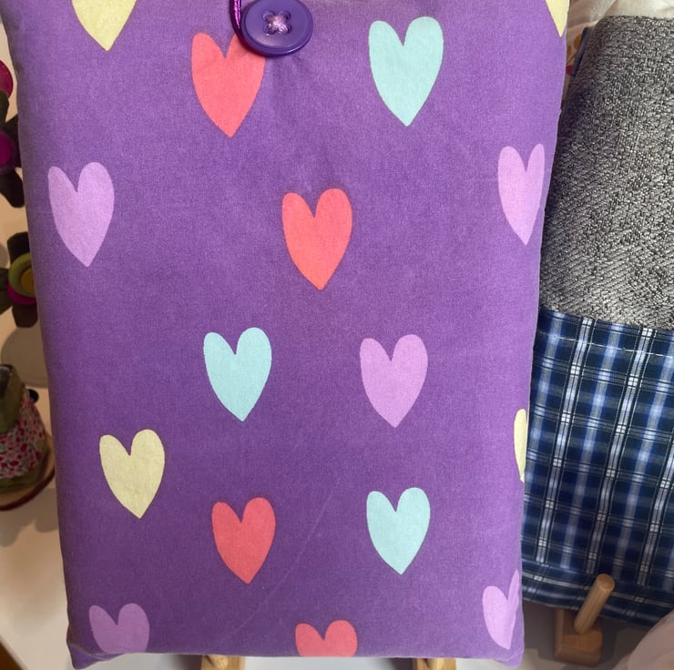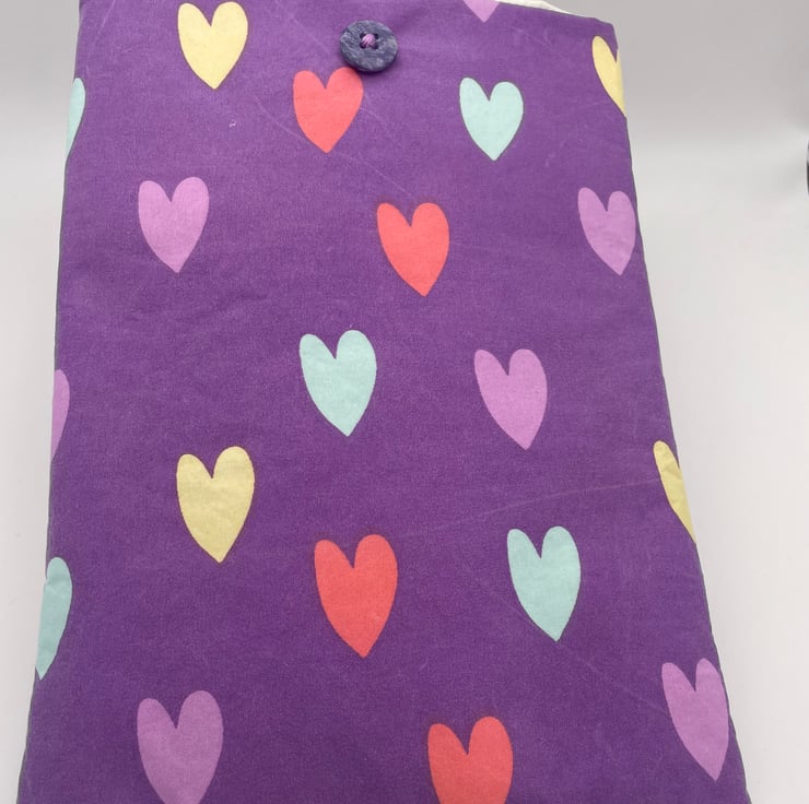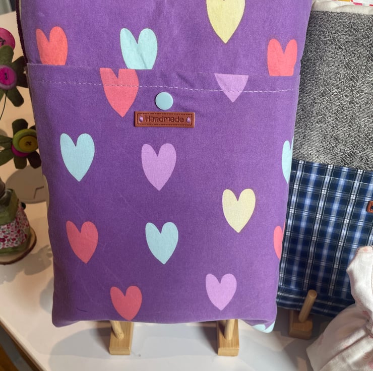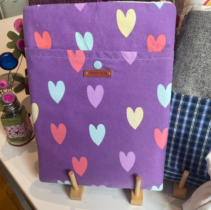 This lovely book sleeve is hand made with predominantly recycled materials. Some parts have newly sourced materials (e.g., buttons, thread and hair ties etc). It is 8 x 10 inches (approx) This has a pocket on one side for additional items such as pens, notebooks or snacks. These are so handy.