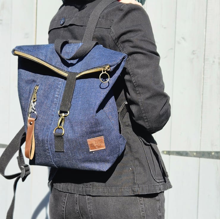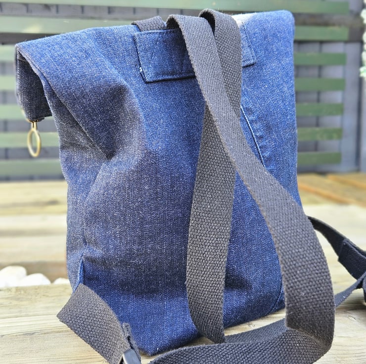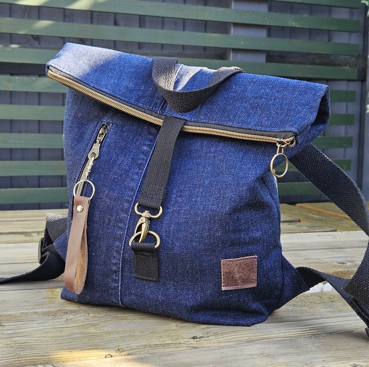 This stylish and practical backpack has a unique touch. I've handcrafted this upcycled denim roll-top backpack from dark blue jeans, giving them a second life while maintaining its durability and trendy style.