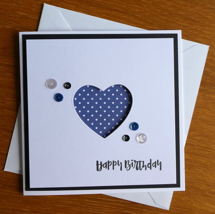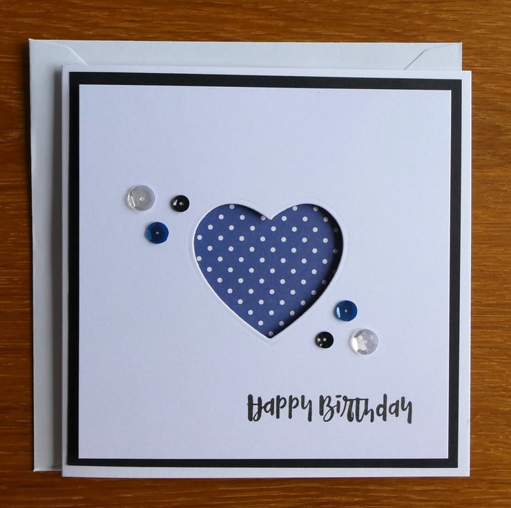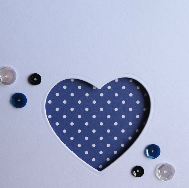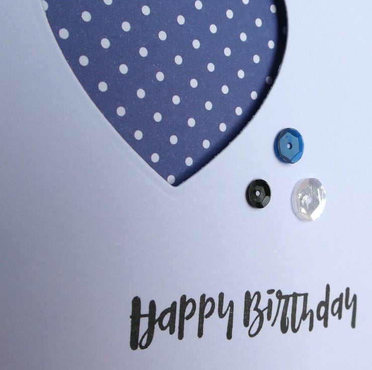 This simple and elegant birthday card has a navy blue and white polka dot background which can be seen through a heart shaped aperture.