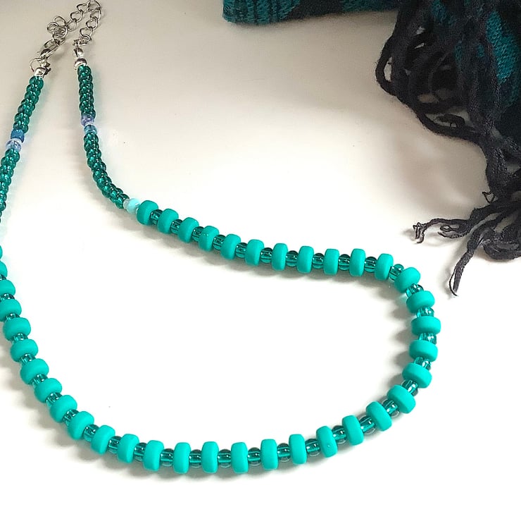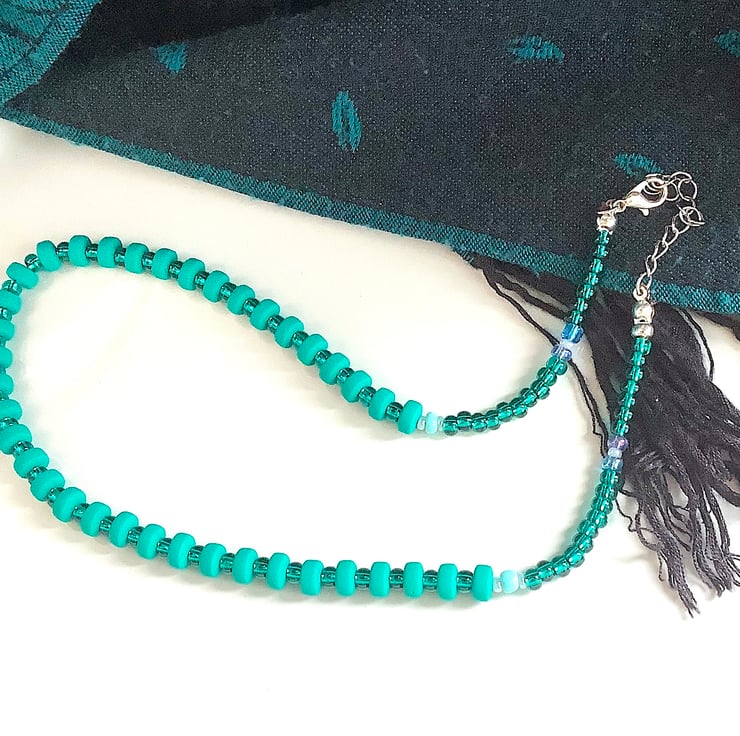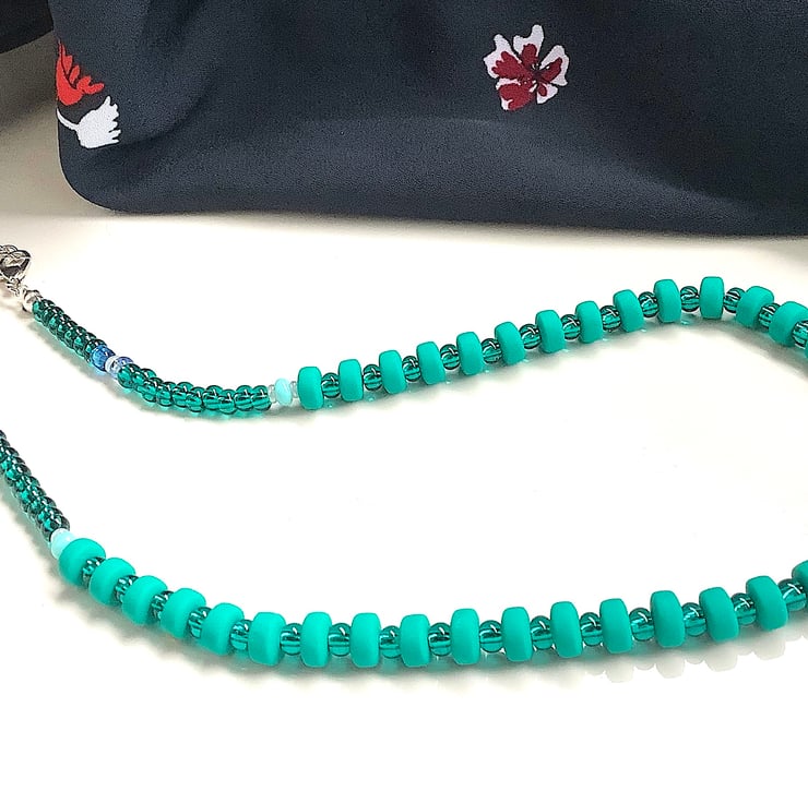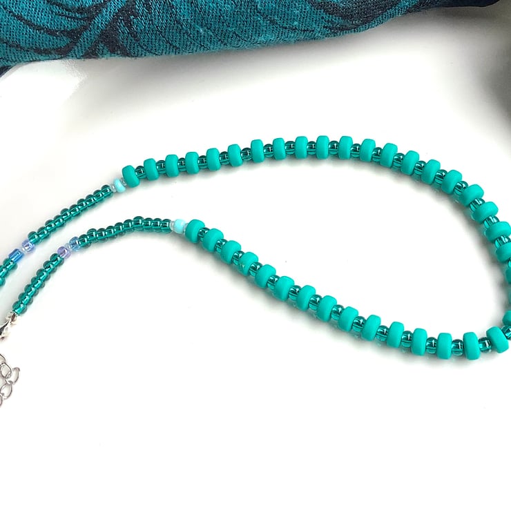 This necklace is lovely turquoise teal colour with light colour spacer beads; 43 cm length. Minimalist simple bead necklace, ideal gift for girls