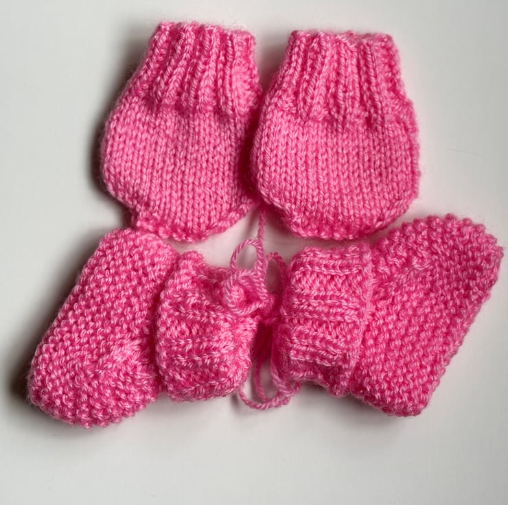 Carefully crafted baby booties and mittens with pink and soft acrylic yarn. Beautifully packed as a gift without any unnecessary tags so can be gifted right away. This would fit baby up to 3 months and would be perfect as a baby shower gift, prop for a newborn photoshoot, gender reveal or just as is for day-to-day practical use.