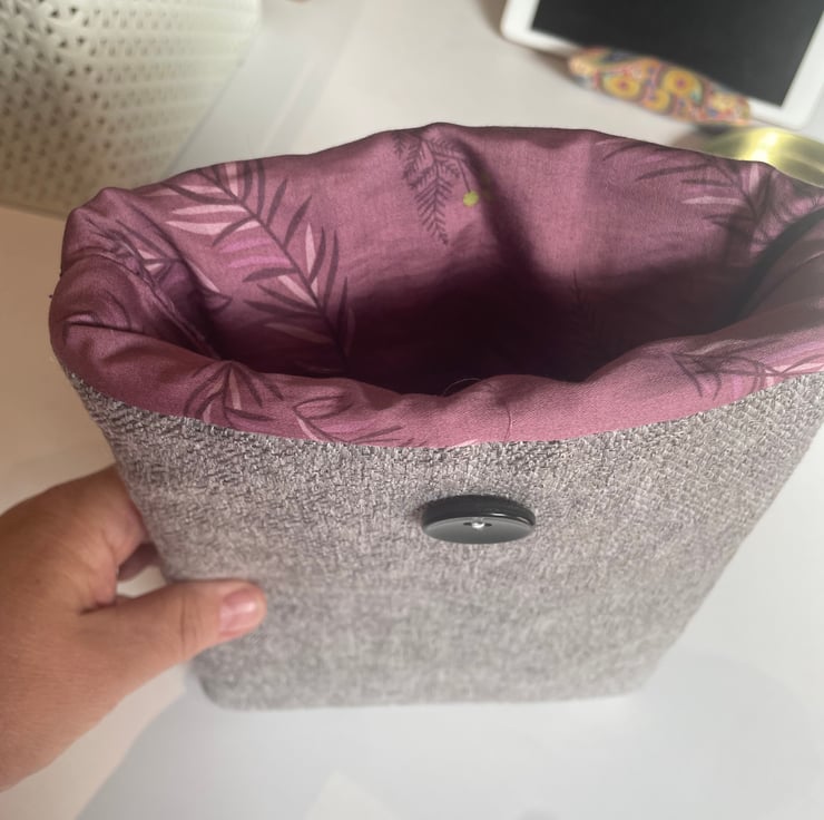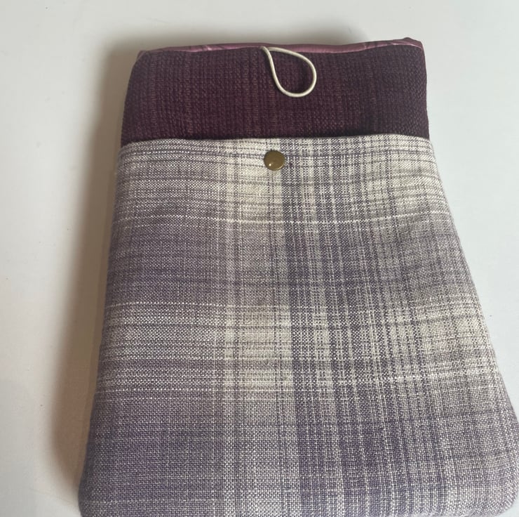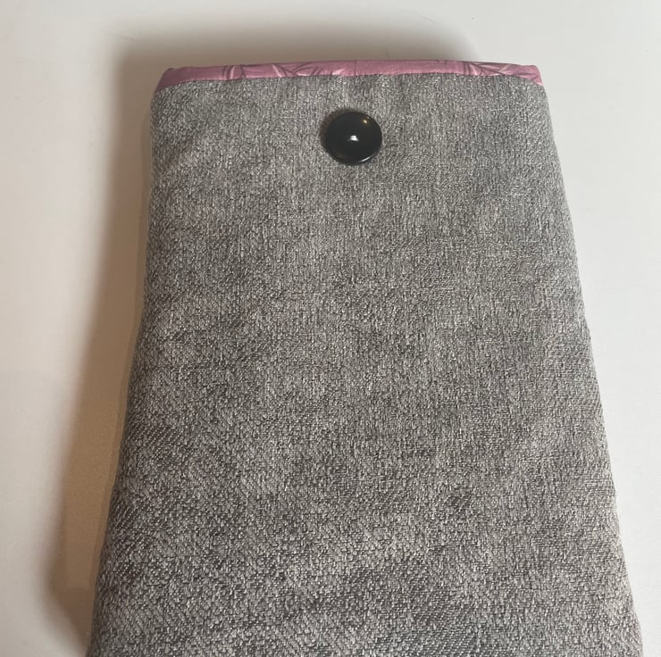 This lovely book sleeve is hand made with predominantly recycled materials. They are great for putting in your bag and lots of people use them when commuting or travelling. Some parts have newly sourced materials (e.g., buttons, thread and hair ties etc). It is 8 x 10 inches (approx) This has a pocket on one side for additional items such as pens, notebooks or snacks.