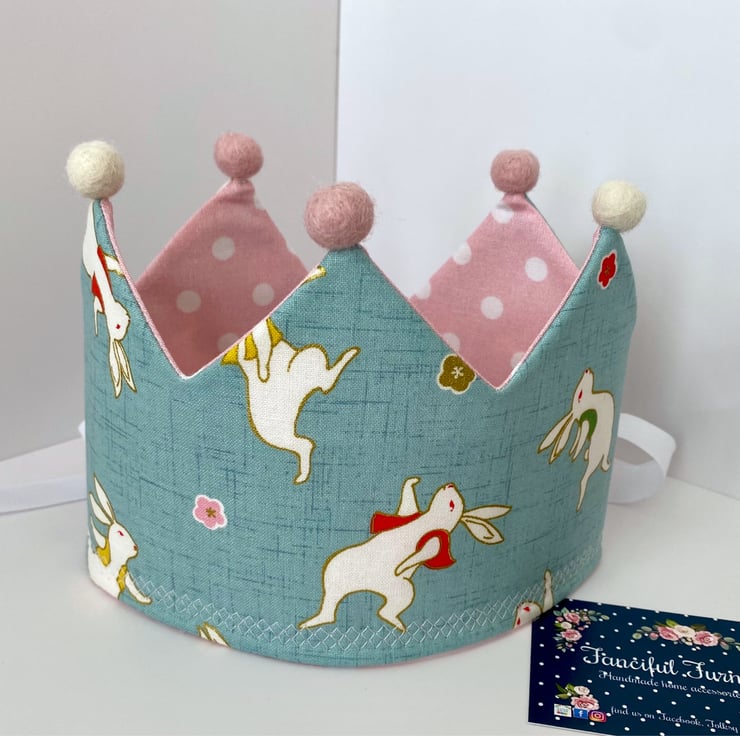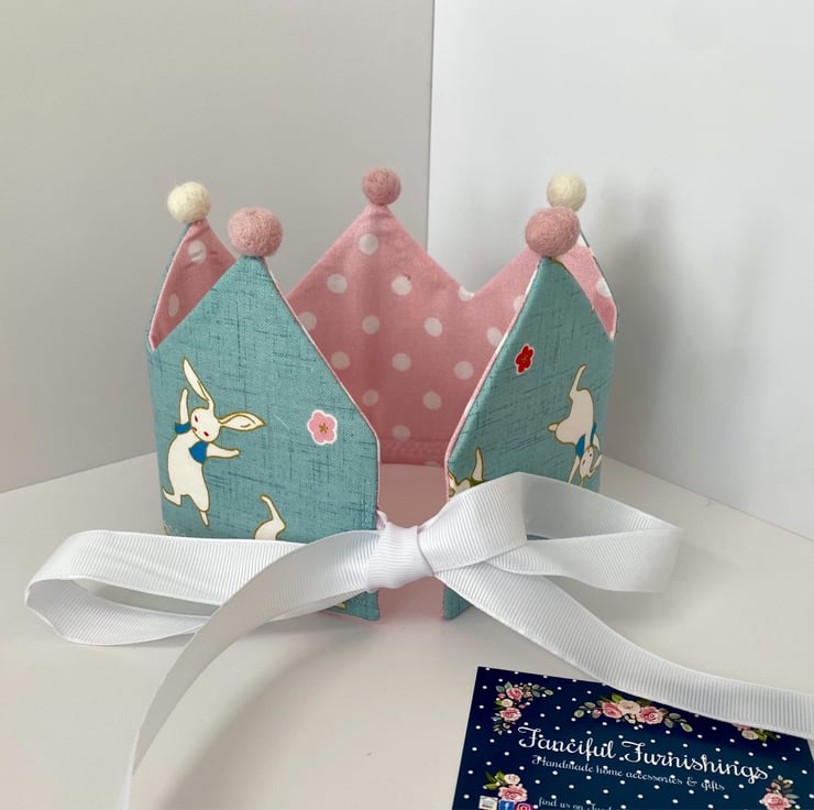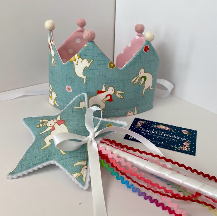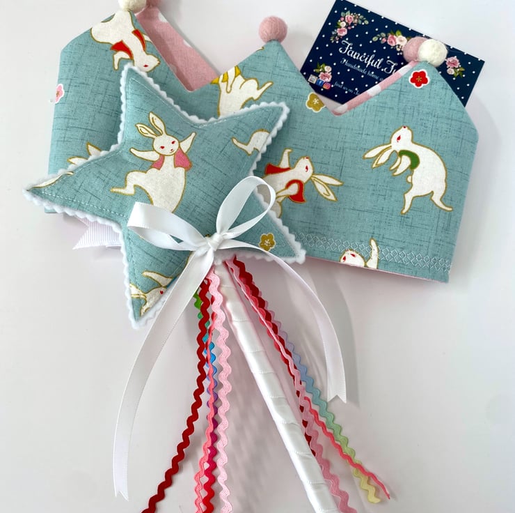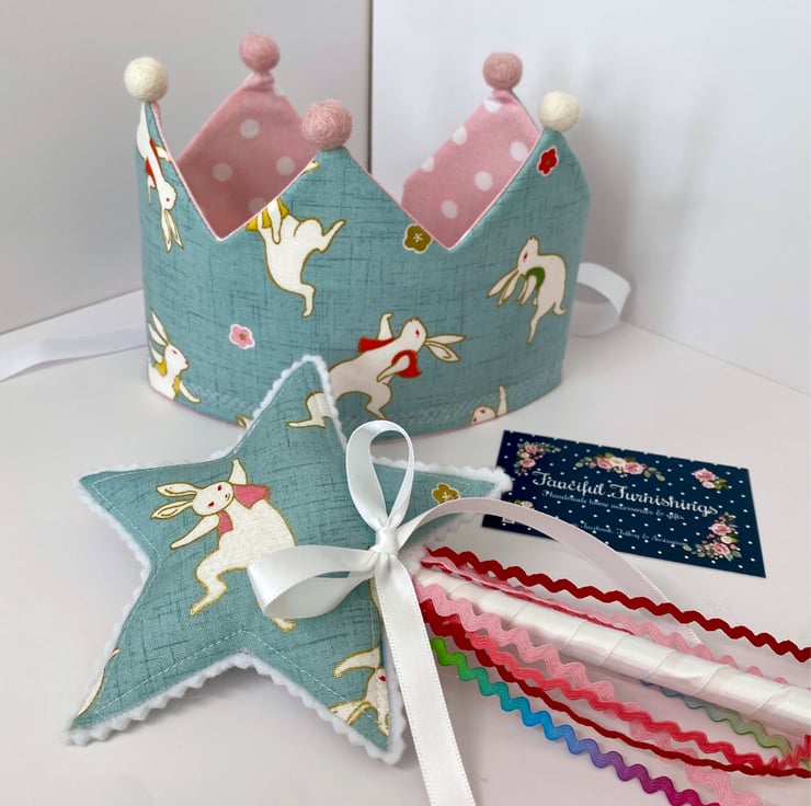 Child’s pretty fabric crown with matching wand. Ideal for dressing up or I can personalise this set with a name or a number if you’d like it for a birthday or party celebration. The crown ties at the back with coordinating ribbon so it will fit a range of head sizes.