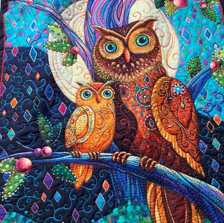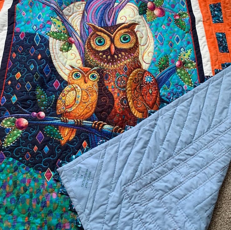This is a colourful hand quilted large throw size quilt that I have hand quilted.. The backing is plain pale blue cotton fabric and the wadding is Hobbs polyester. Very easy to care for, just machine wash on a cold wash with a few colour catcher sheets.
