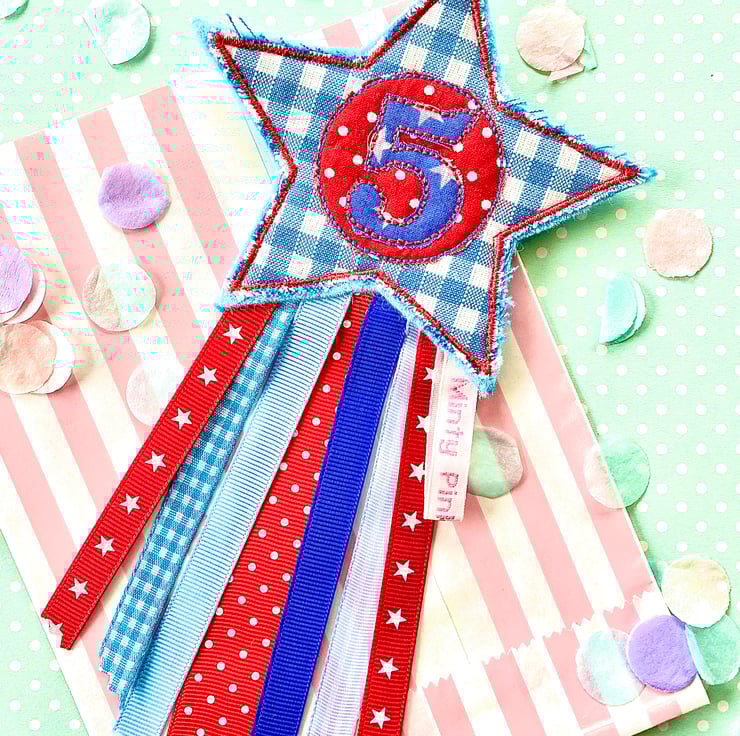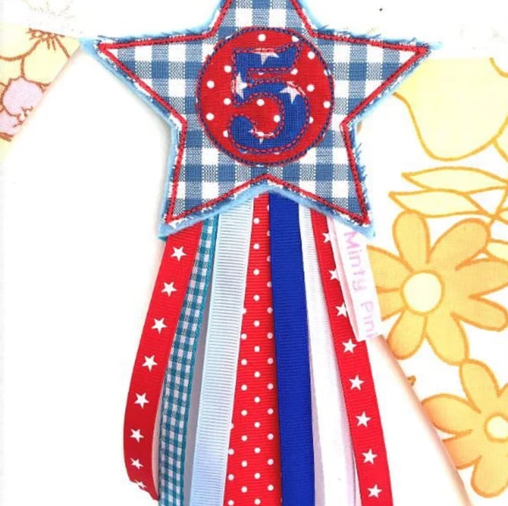 This bright and colourful birthday star badge would make any 5 year old happy on their special day. Made by layering fabric and felt and using many red, white and blue ribbons. A safety brooch back fastening is used on the back, though a child should not be left unattended wearing this item. This is not a toy.