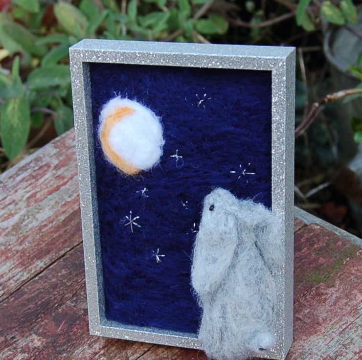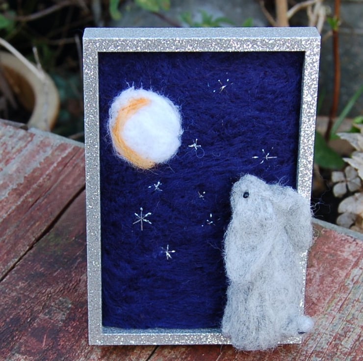 The background for this lovely hare and moon picture has been made by needle felting using wool fibres onto a piece o blanket. Hand stitched silver stars and a big moon complete the sky. The moongazing hare has been needle felted into shape and placed gazing up at the moon. The sky is multi toned blue fibres with a white needle felt moon and hand stitched stars.