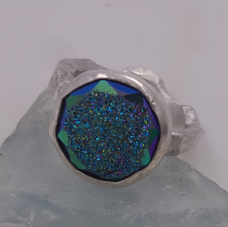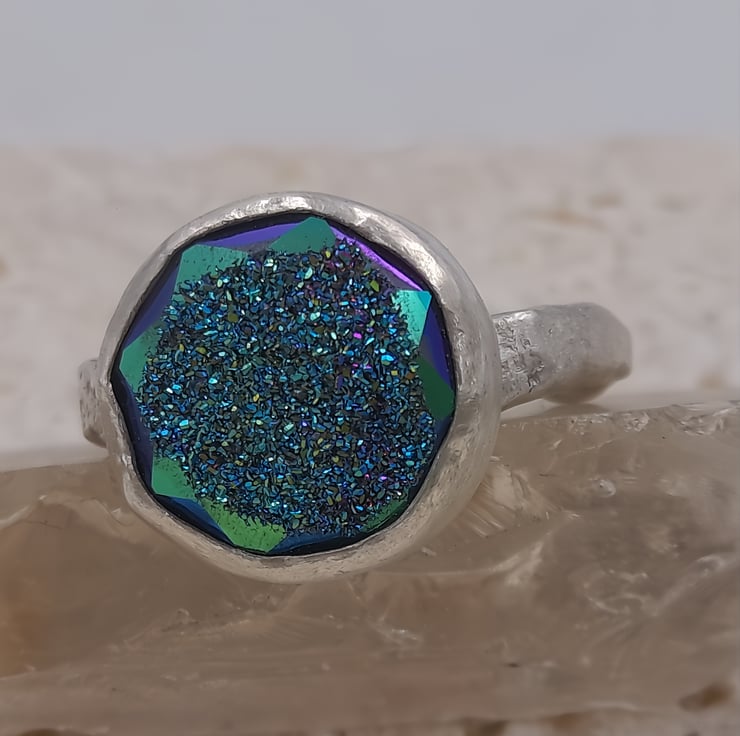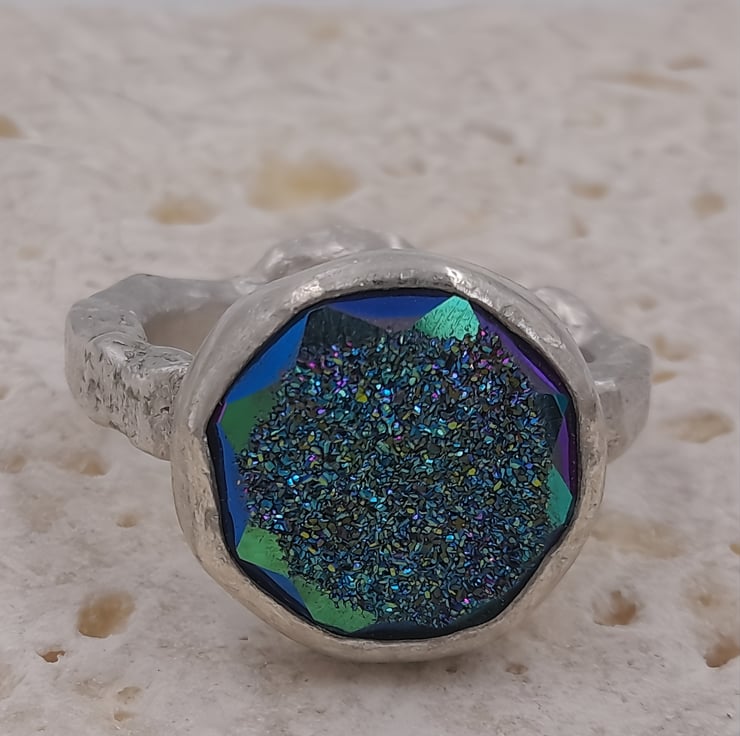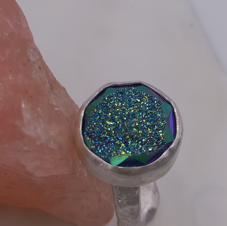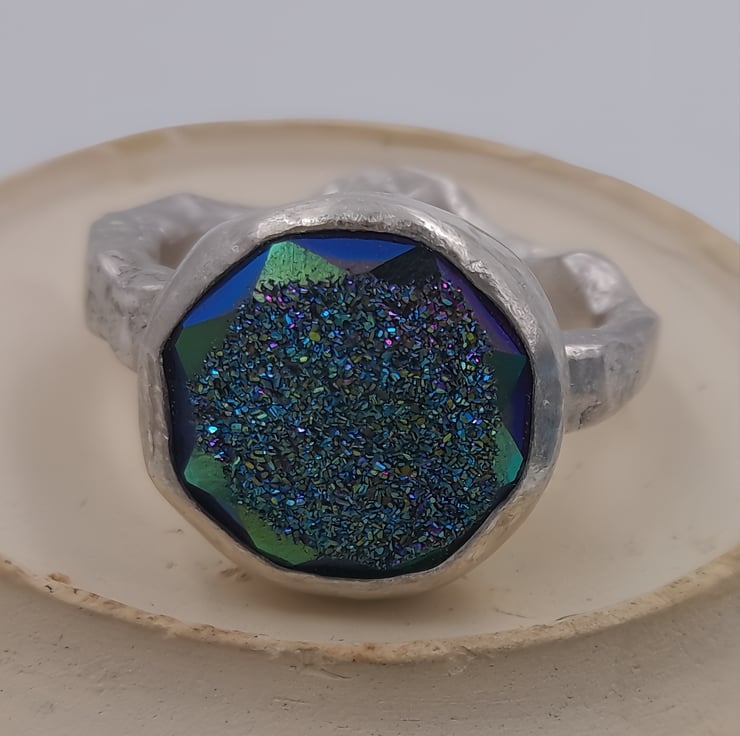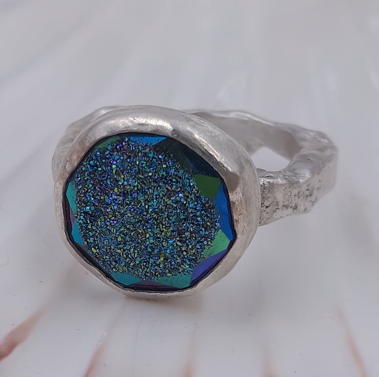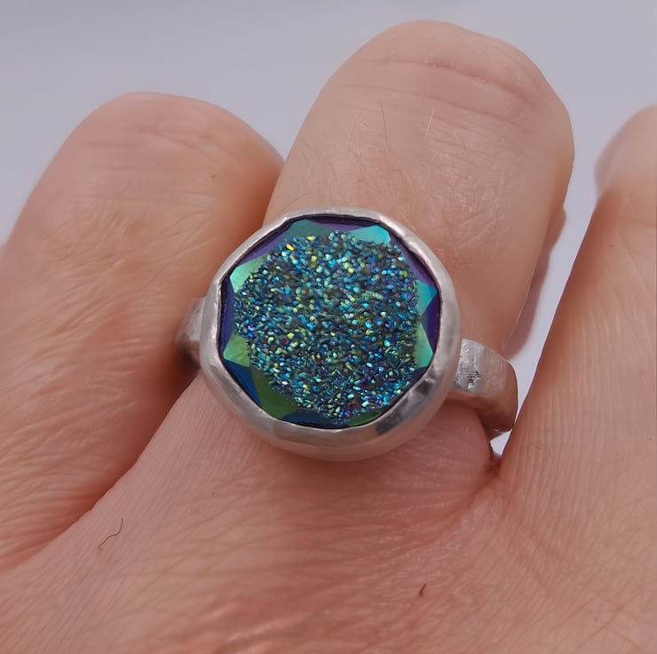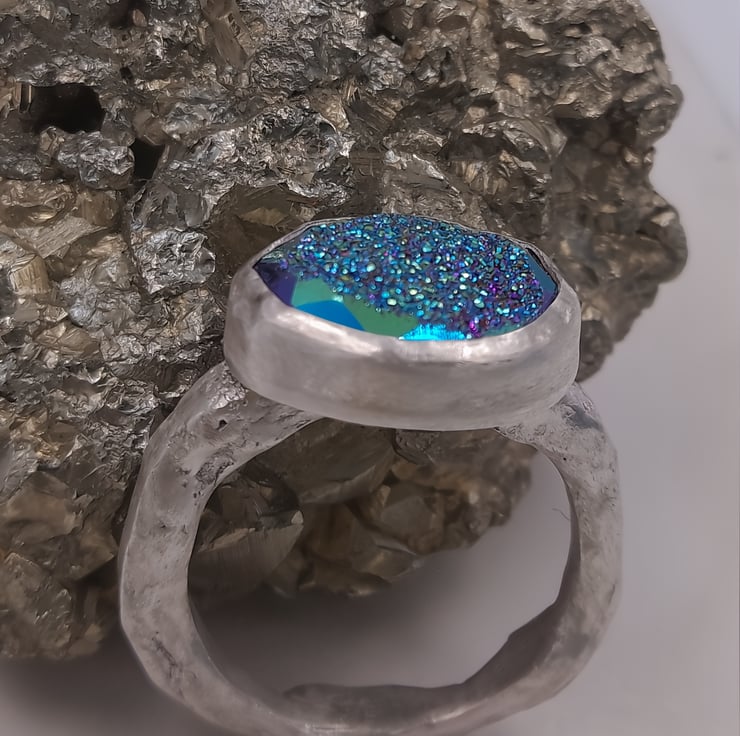 Add a touch of elegance and shimmer to your jewellery collection with this stunning handmade sterling silver ring, featuring a mesmerising peacock blue druzy cabochon. The iridescent sparkle of the druzy stone shifts between deep blues, teals, and hints of violet, making it a captivating statement piece. Set in a sturdy hand forged sterling silver band, this ring is durable and perfect for everyday wear or special occasions.