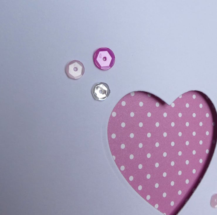 This simple and elegant card has a bright pink and white polka dot background which can be seen through a heart shaped aperture. It could be sent as a new baby, get well, engagement or anniversary card or as a birthday card.