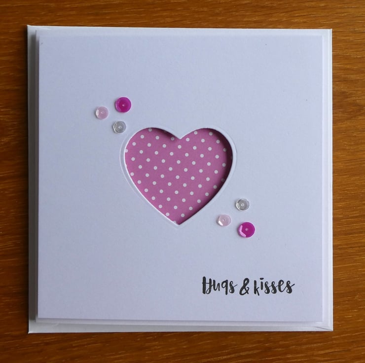 The card has been hand stamped with the message Hugs & Kisses in black archival ink and the design has been completed with a mix of pink and silver sequins.