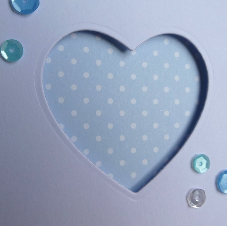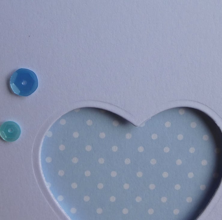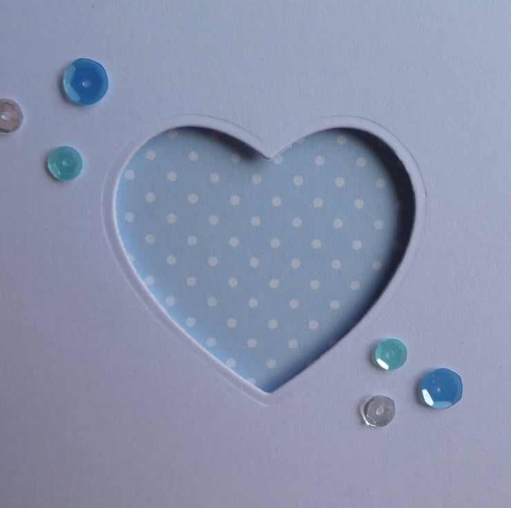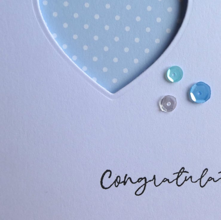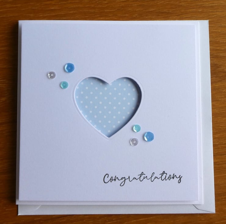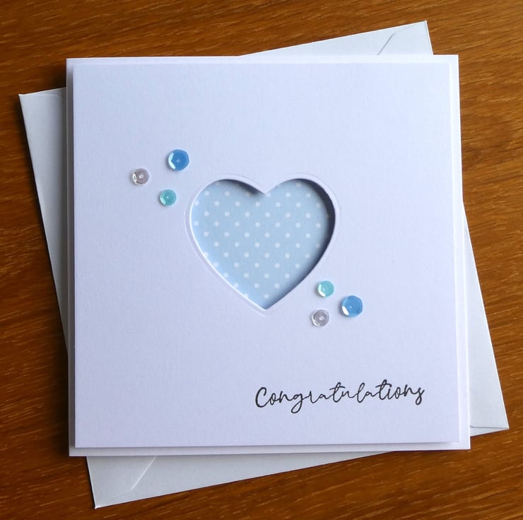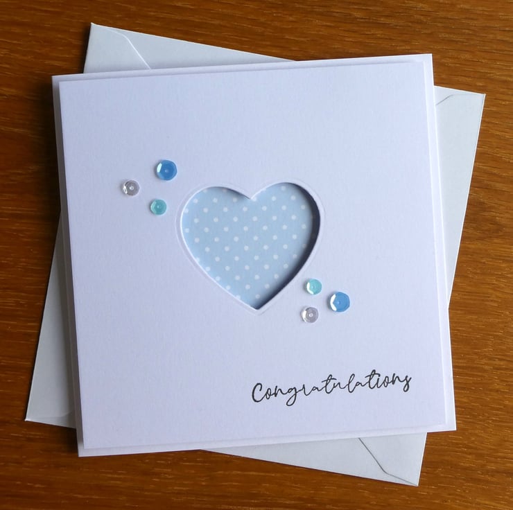This simple and elegant congratulations card has a pale aquamarine and white polka dot background which can be seen through a heart shaped aperture. It could be sent as a new baby, new job, engagement or anniversary card or to send congratulations on many other occasions or as a birthday card.