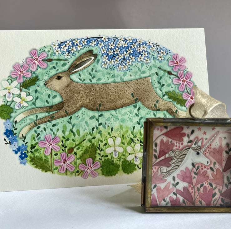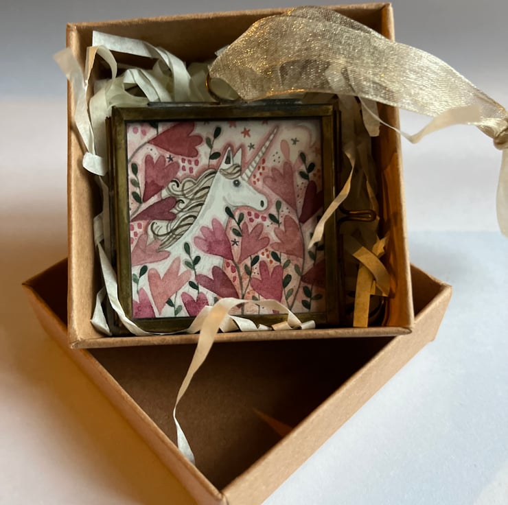Gift and Card comprises an original small painting in frame, gift boxed, and a card of your choice. Put your card selection in the notes to seller. The small painting is about 5cm and comes with ribbon for hanging.