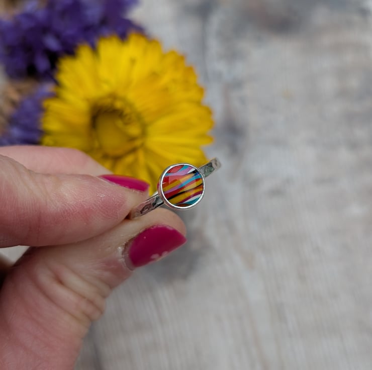 This one-of-a-kind ring features a vibrant round Surfite stone set in recycled sterling silver. The 7mm Surfite cabochon displays bold stripes of colour, each layer telling a story from its origins in surfboard resin. The silver band has been hammered by hand for a soft, light-catching texture.