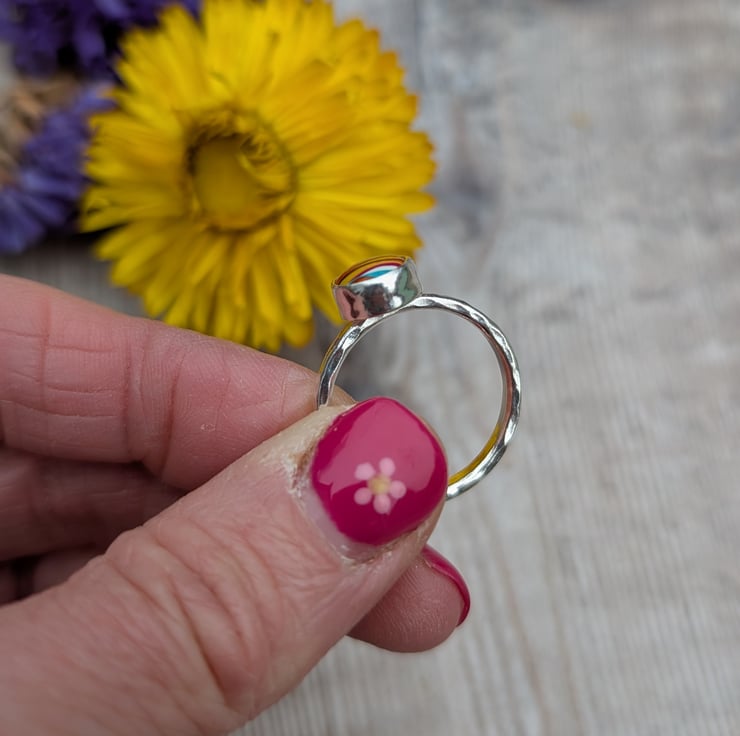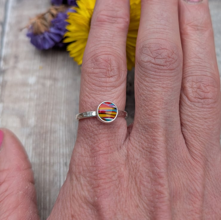 Made to a UK size O, this handmade ring brings together sustainable materials and colourful detail in a simple but striking design.