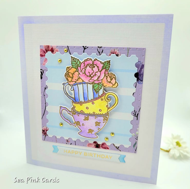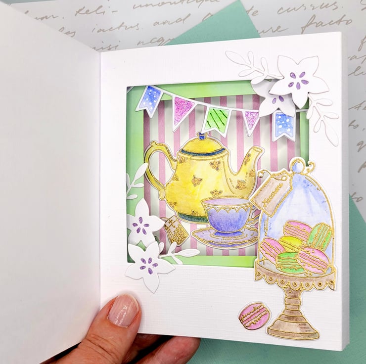 All of the images are stamped by hand and heat embossed in gold for added texture. I then hand-painted them with watercolour paints, for a soft finish. I made the outer and inner card from sheets of 300 gsm white linen cardstock and used cutting dies to make the openings for the 'tunnel' effect. There are lots of lovely little features like bunting, flowers and the trappings of afternoon tea. The tea-cups on the front are popped up with slim foam pads for 3D effect, on a postage stamp edged square and patterned paper. There is a simple gold foiled sentiment, happy birthday, also several gold decorative crystals on the front for decoration.