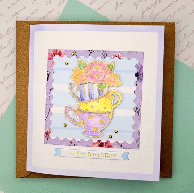 A detailed 3D birthday card, handmade with a fun surprise element. The card has the appearance of a regular card and closes flat, but when it's opened by the recipient, it reveals a lovely decorative scene inside. It has an afternoon tea theme, created with a 'tunnel' or 'shadow box' effect. Individually handmade in my craftroom using quality materials, this unique dimensional card measures 14 x 15 cms and comes with a 100% brown recycled kraft paper envelope.