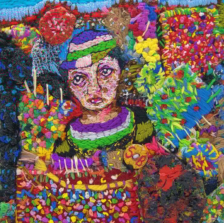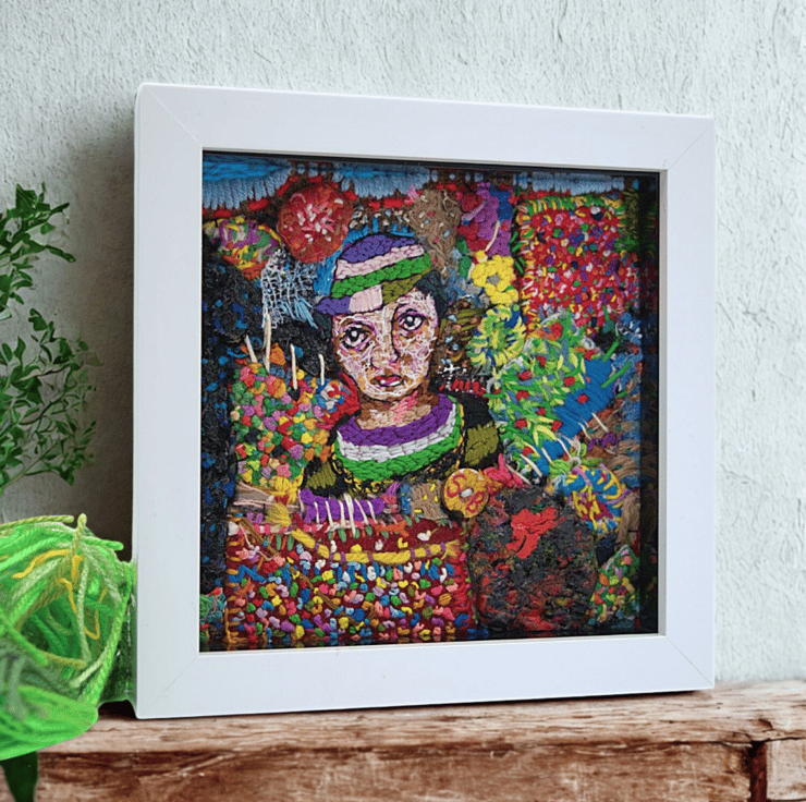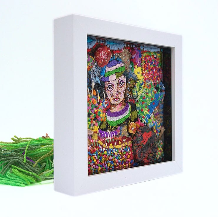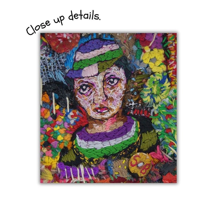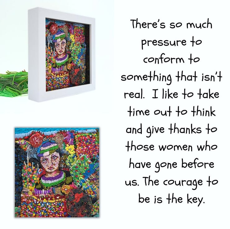 This is an original framed hand stitched artwork. It depicts a woman standing proud in her feminist colours. The background stitching represents the importance of the environment and nature. Each stitch has been completed by hand using a variety of silk and wool threads.