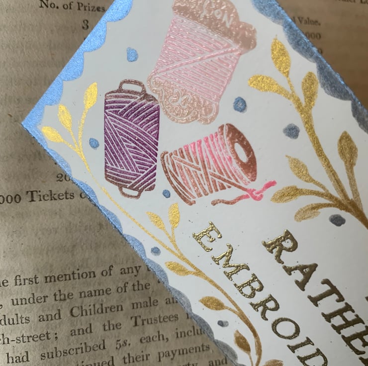 The design is very pretty, using a combination of embossed and hand painted elements. The metallic watercolour adds a beautiful shimmer to each bookmark, especially to the scalloped border.