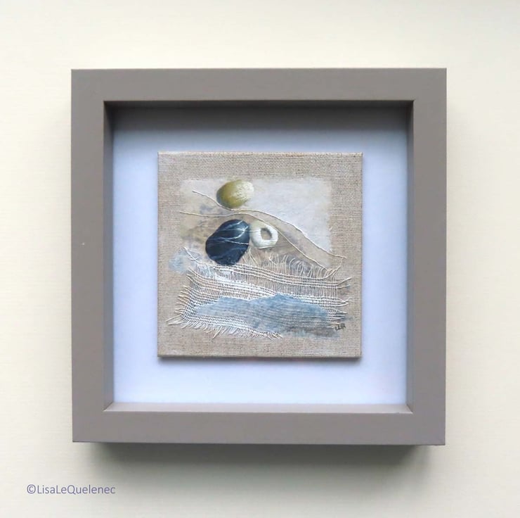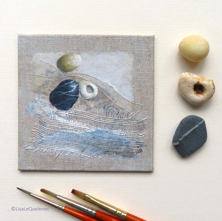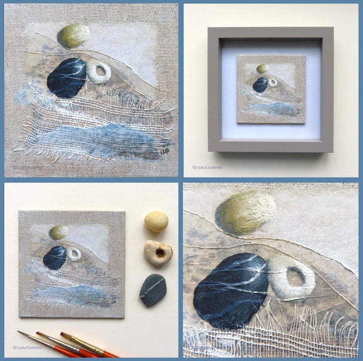 Using artist quality acrylic on canvas board with paper and fabric, this painting is 4x4inch (10x10cm) and comes unmounted and unframed. It is suitable for framing or can happily stand propped up on a shelf. The painting will be shipped in protective tissue, sealed in a cellophane bag and nestled in between card for added protection.