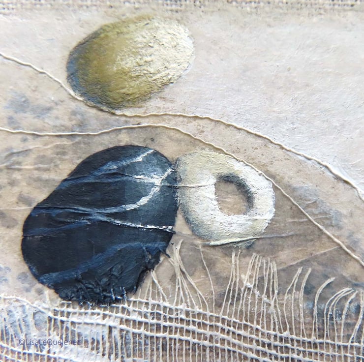 On the shore - A mixed media and collage composition on linen canvas board. A reminder of happy days spent on the shoreline.