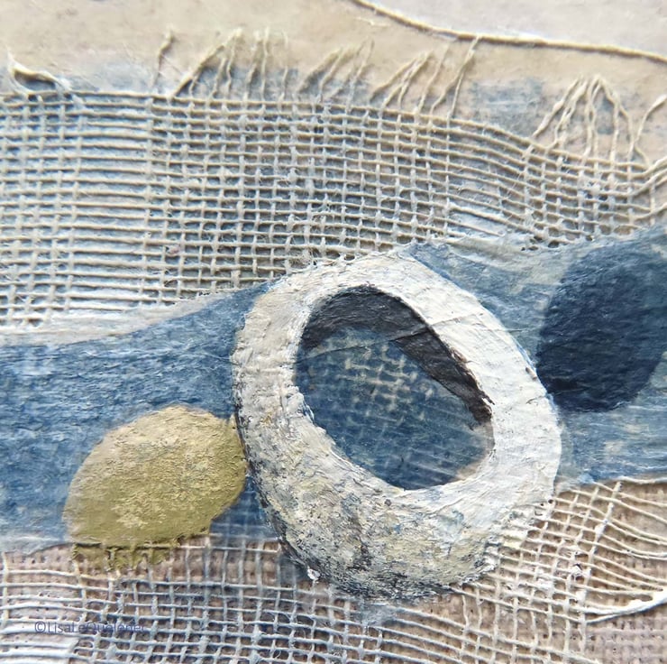 Treasures on the shore - A mixed media and collage composition on linen canvas board. A reminder of happy days spent on the shoreline.