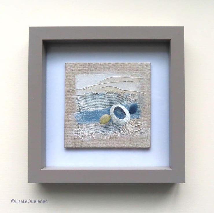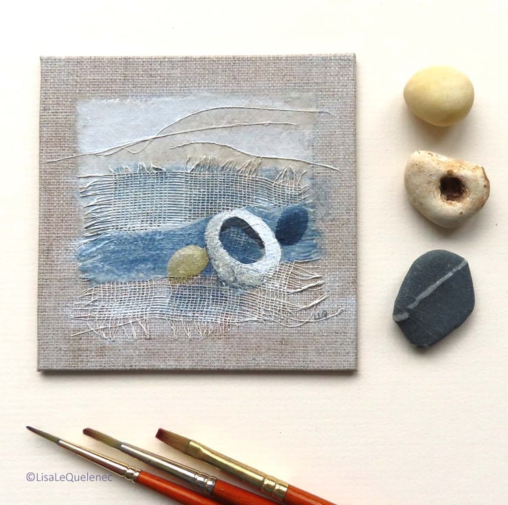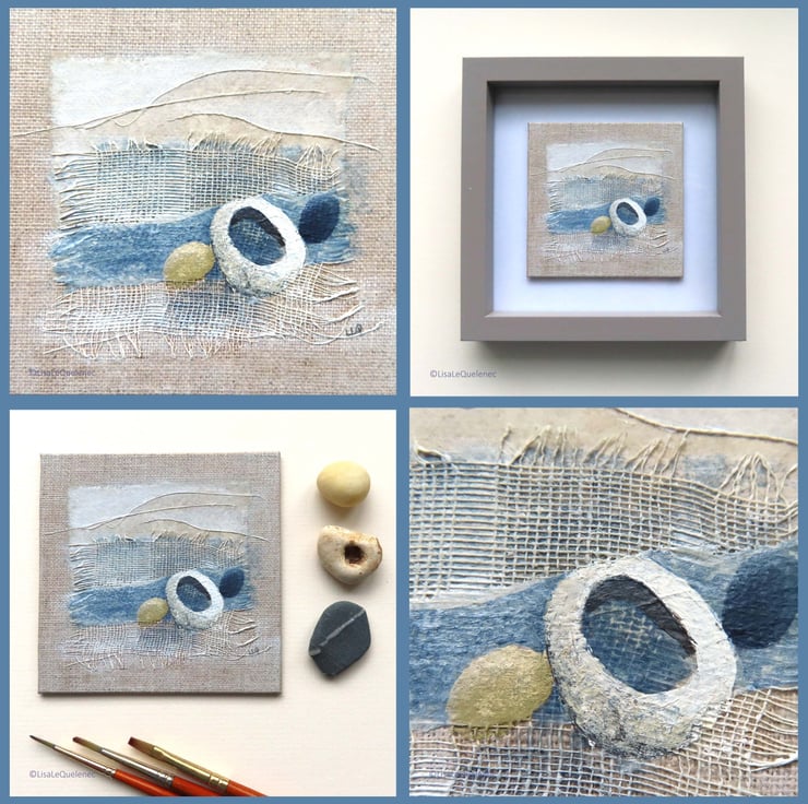 Using artist quality acrylic on canvas board with paper and fabric, this painting is 4x4inch (10x10cm) and comes unmounted and unframed. It is suitable for framing or can happily stand propped up on a shelf. The painting will be shipped in protective tissue, sealed in a cellophane bag and nestled in between card for added protection.