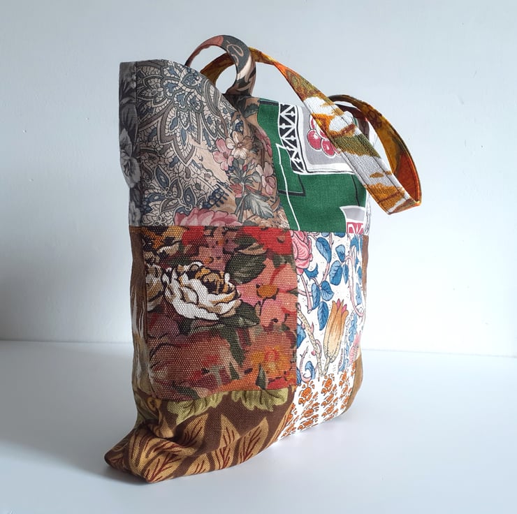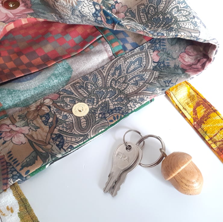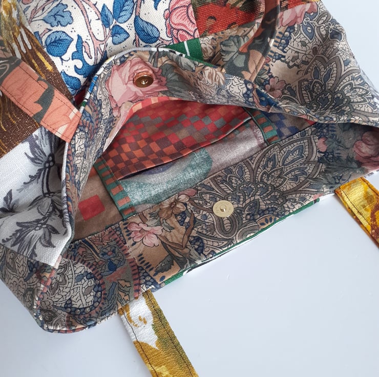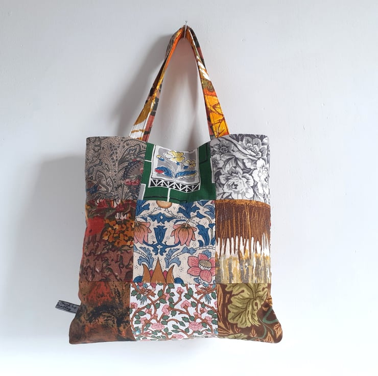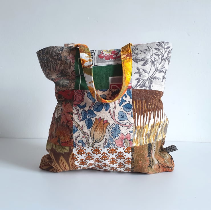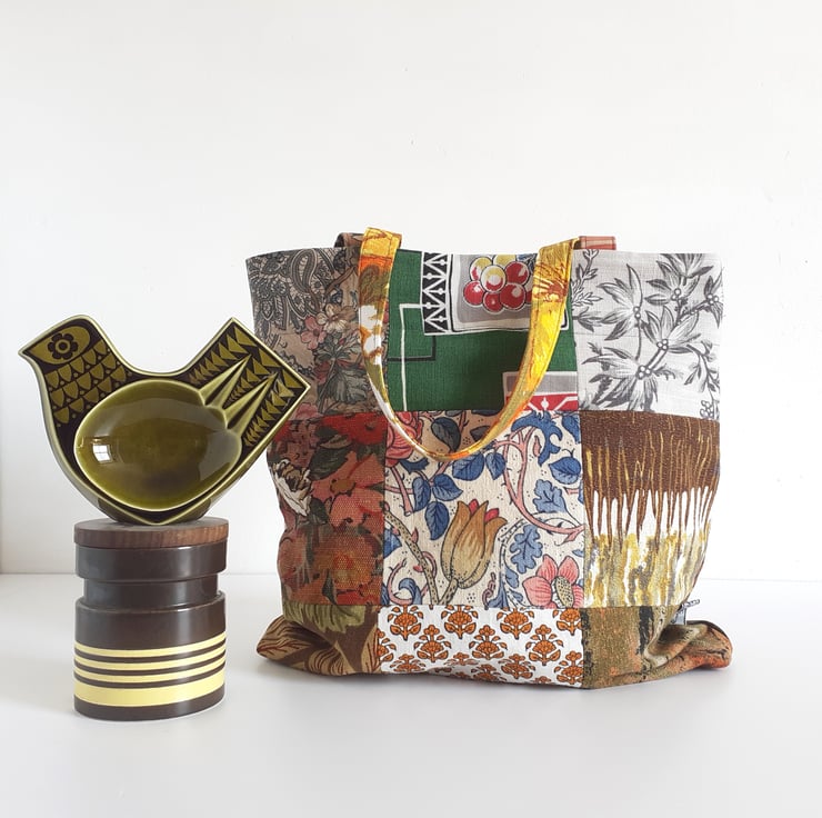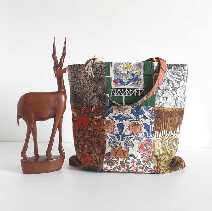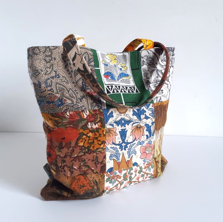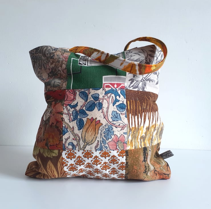 This patchwork handbag or bucket bag is constructed from some lovely vintage fabrics. From William Morris to Liberty, they all have beautiful design work.