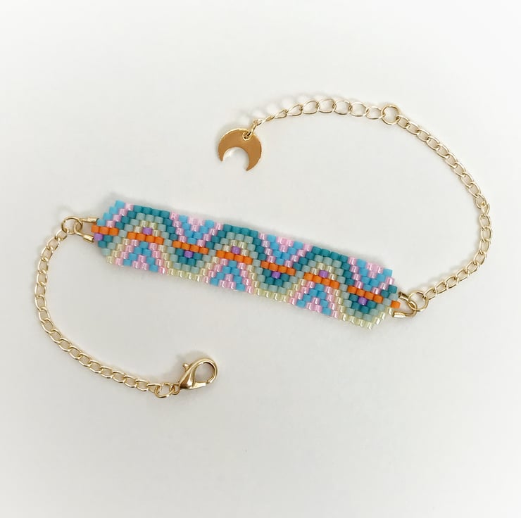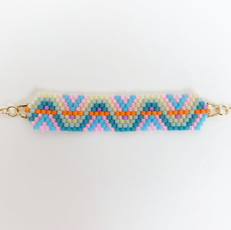 This delicate bracelet was made using beautiful tiny Japanese glass beads called Miyuki Delica. There is a mix of matt and luster beads The pattern was inspired by art deco and geometric designs.