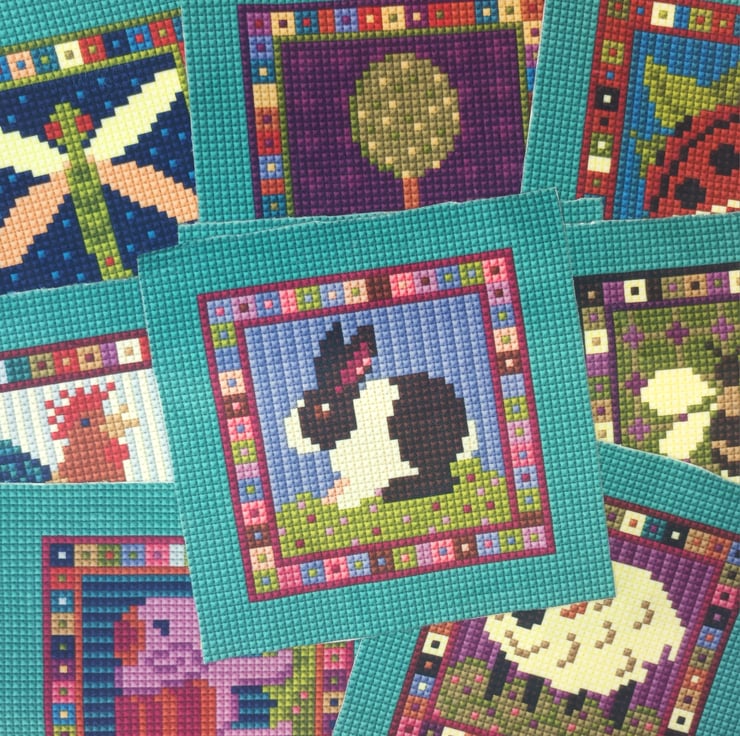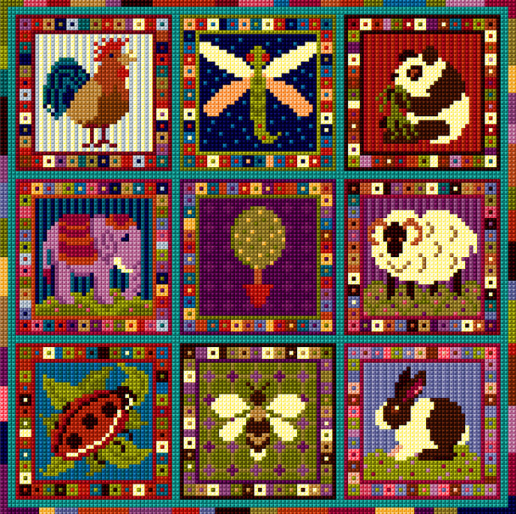 The project is Little Animals Patchwork, an adorable collection of animals (and a lemon tree!) sewn using Victorian Cross-stitch on a single piece of canvas.