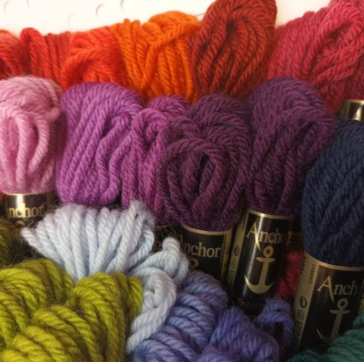 Tapestry wool, needles, canvas, organza bag, thread cards, folder, instructions, wool shade palette and an exclusive lucky dip block printed on velvet, to sew into a wee purse or pincushion.