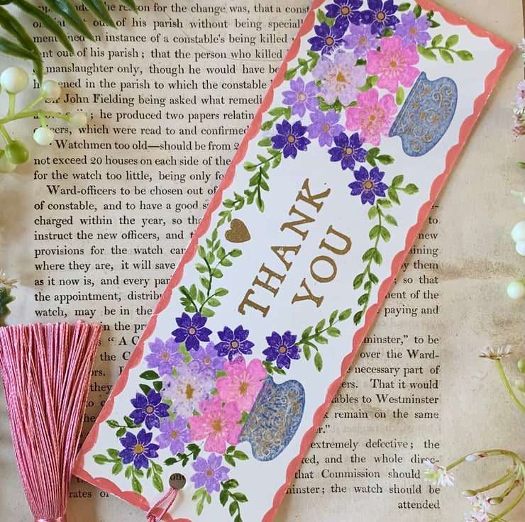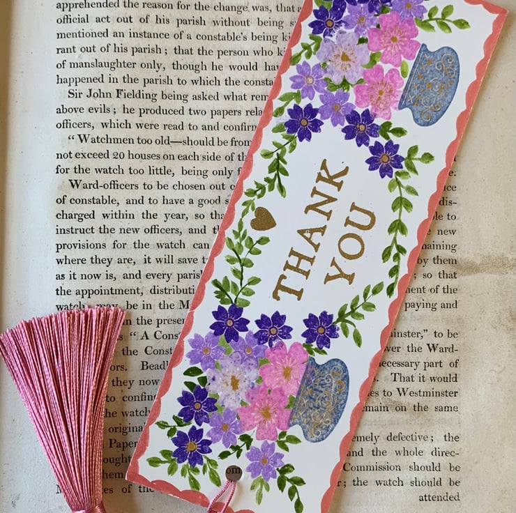 This beautiful hand made bookmark is a perfect Thank You gift for a book lover.The bookmark doubles as a greetings card and is much more useful! The reverse is left plain for your own message. This is one greeting that will not be thrown away or saved forever in a drawer.