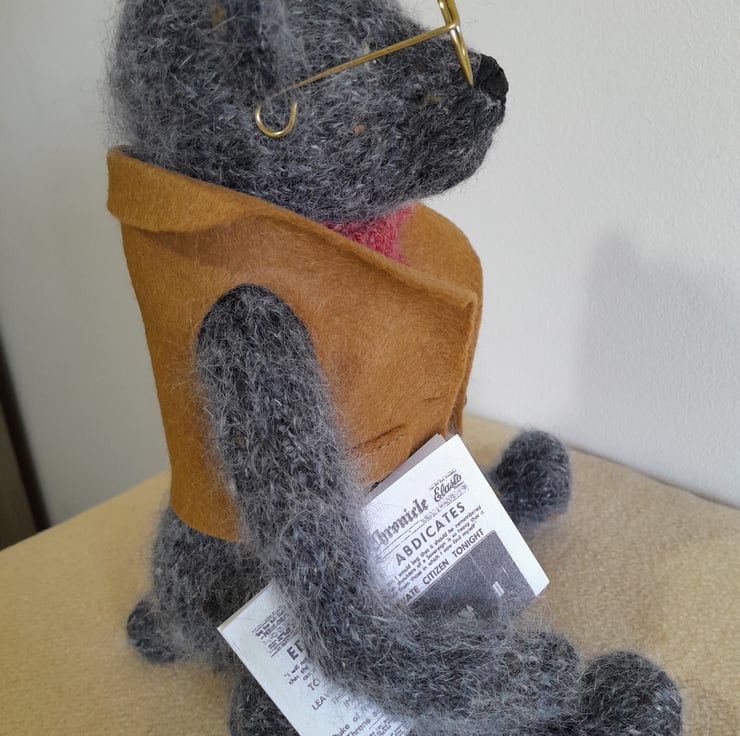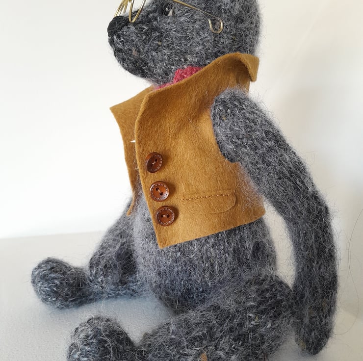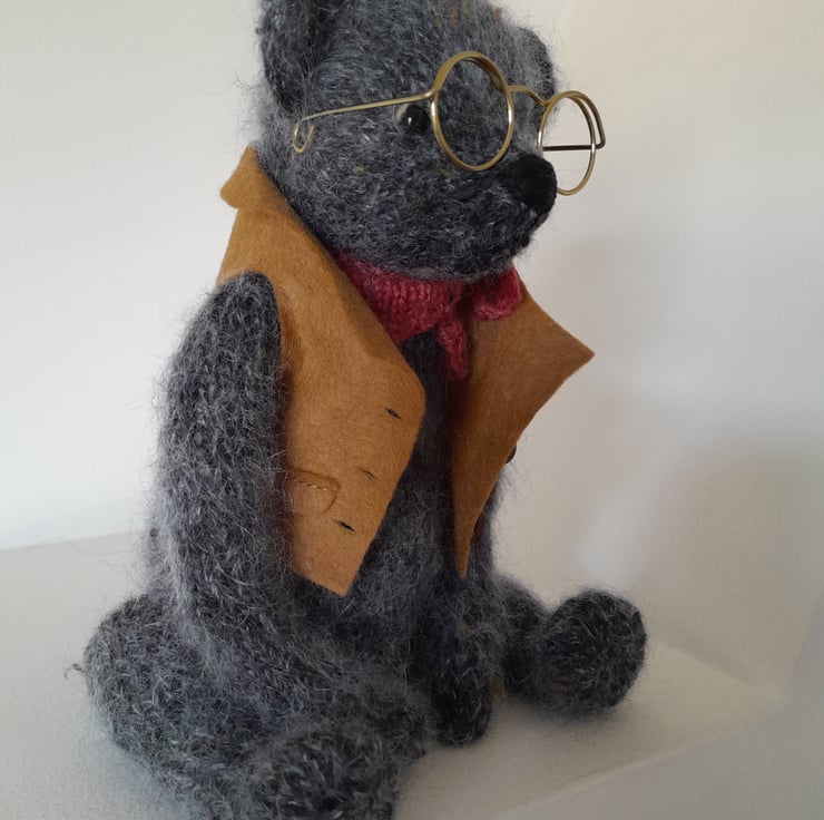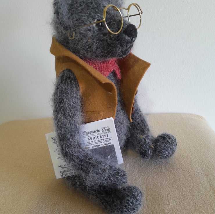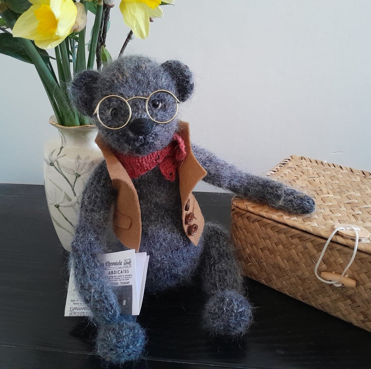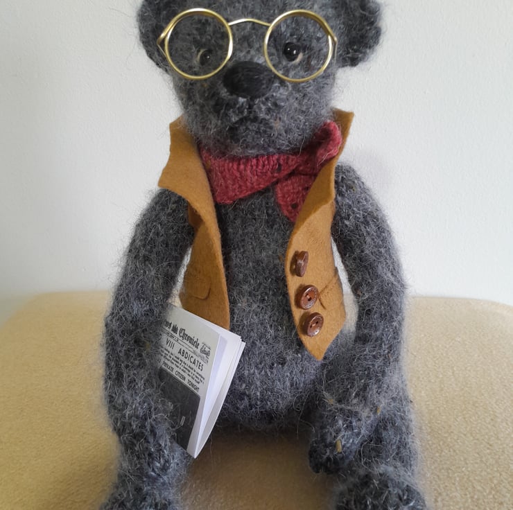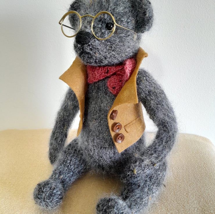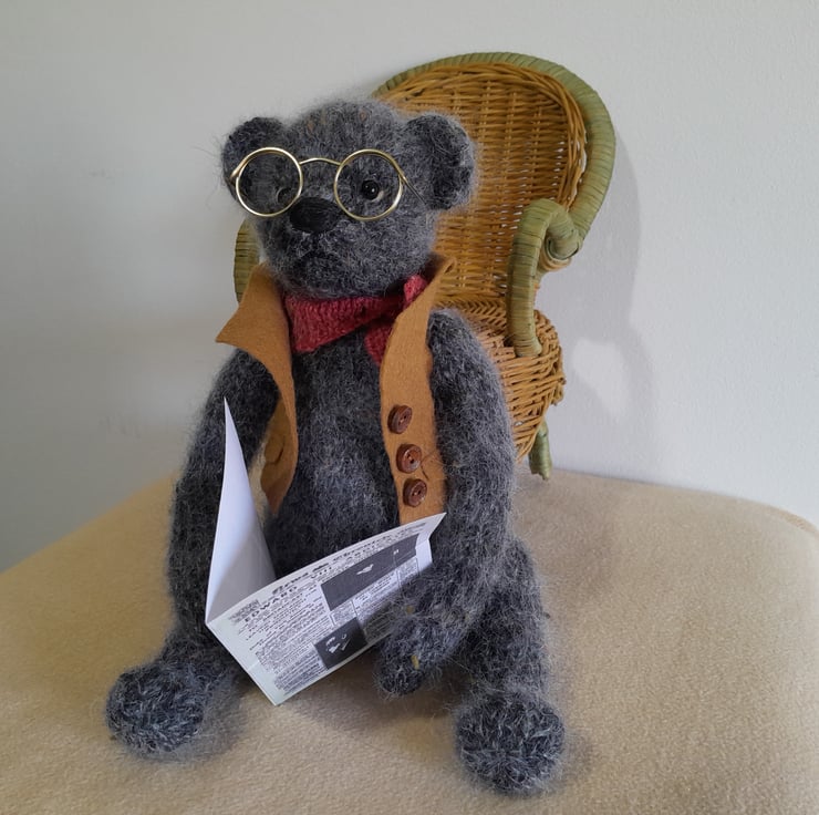 This is Grandpa Bear who measures 10" (25cm) sitting. Grandpa is knitted in a combination of alpaca tweed yarn and kid mohair silk and brushed to create a traditional style of antique style bear. His body is filled with a heavy stuffing and he has a hand embroidered nose. He wears a felt waistcoat in tan brown and a red knitted neckerchief. To help him read his paper he wears a pair of gold frame spectacles.