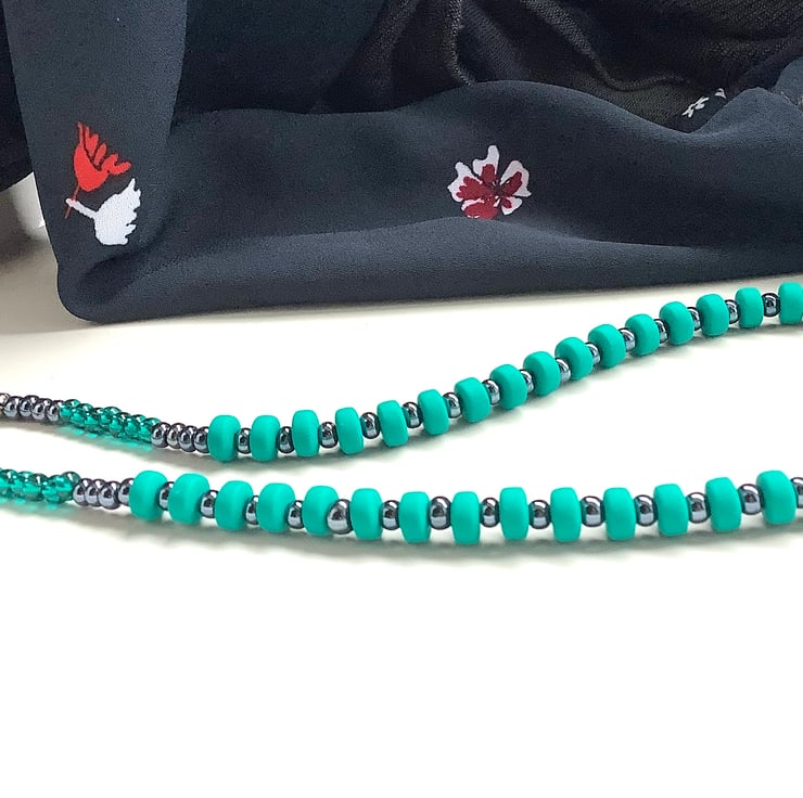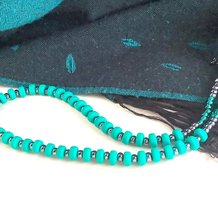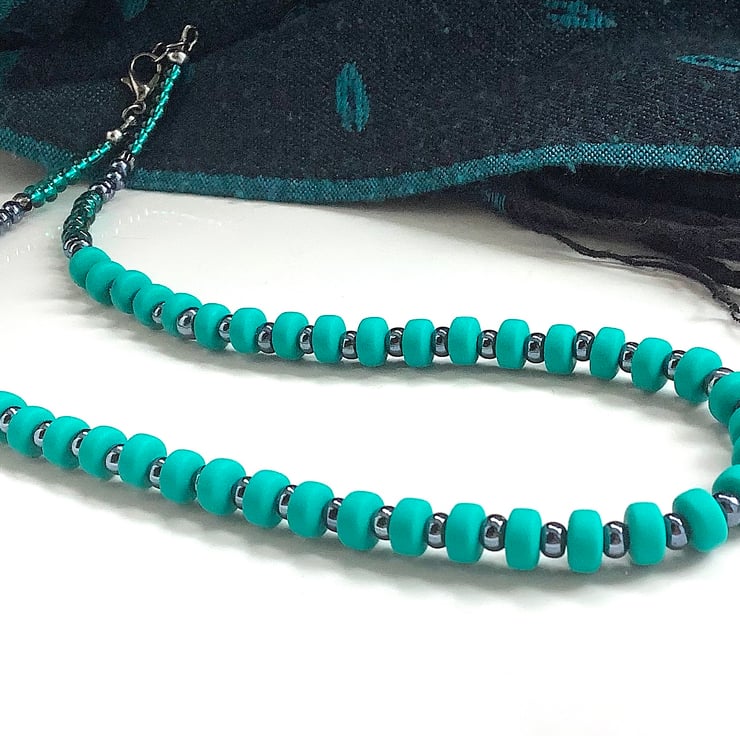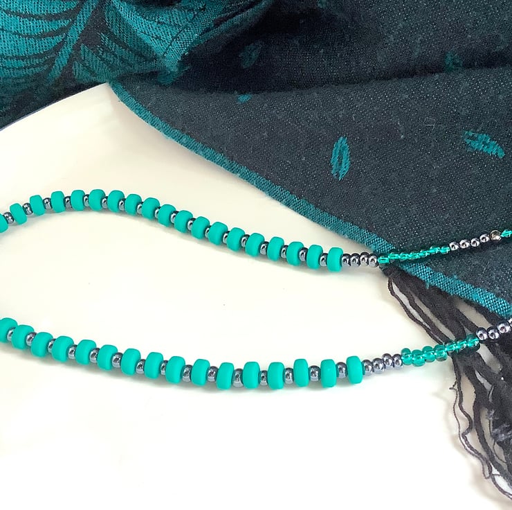 This listing is a beautiful turquoise / teal green polymer clay beads with dark metallic colour seed beads; 41.5 cm length. Minimalist simple bead necklace, ideal gift for girls
